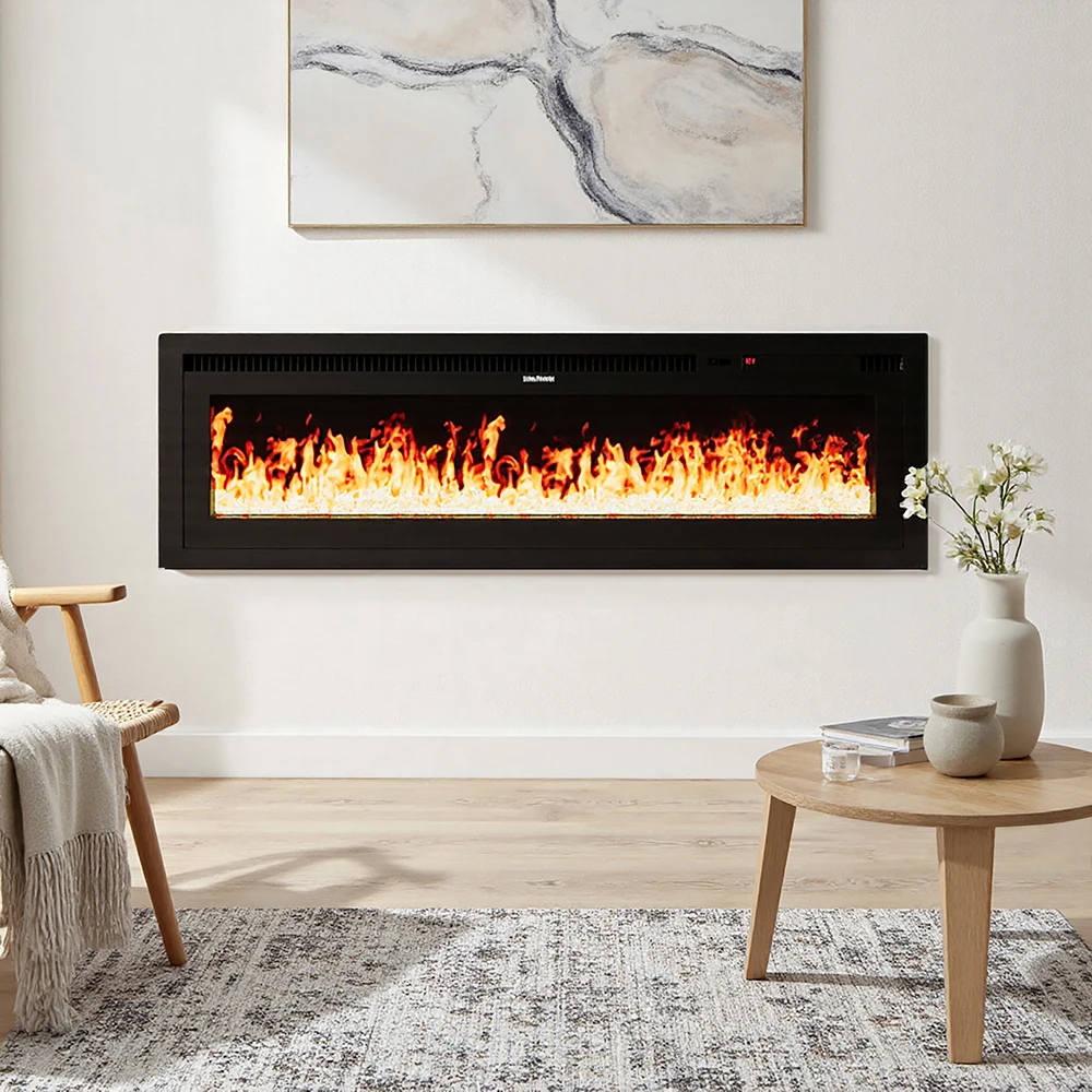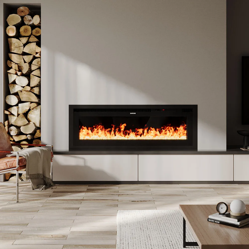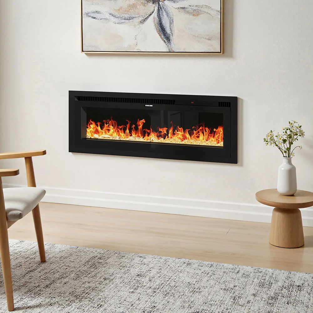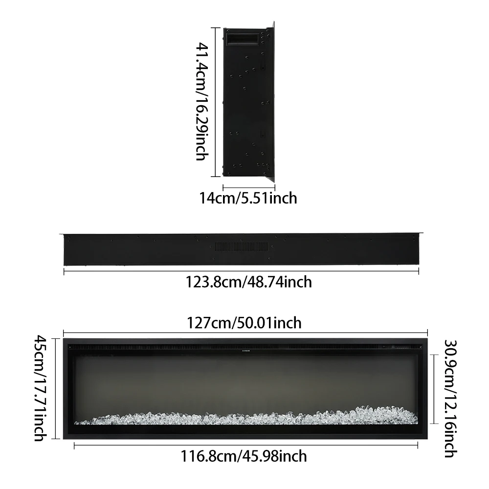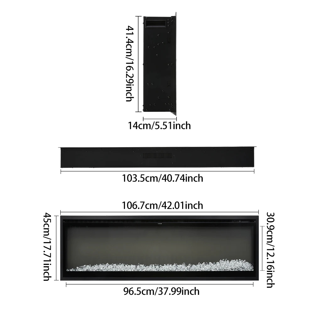 Imagining that your living room features an electric fireplace radiating a warm glow on the night of a cold winter. This multifunctional electric fireplace is equipped with 12 vibrant flame colours, effortlessly creating a pleasant and romantic atmosphere. What is more, you can easily adjust the flame brightness across five levels, either with the remote control or by using the buttons on the glass panel of the fireplace. This flexibility allows you to adjust the flame by your personal preferences. Furthermore, the temperature control feature enables you to select a comfortable range between 62 and 82 degrees Fahrenheit, ensuring warmth fills the entire room. As night falls, you can set the timer to automatically shut off after 1 to 8 hours, saving energy while ensuring safety. Inside the fireplace, dazzling crystal stones shimmer in the flickering flames, adding a touch of luxurious decor to your living space.