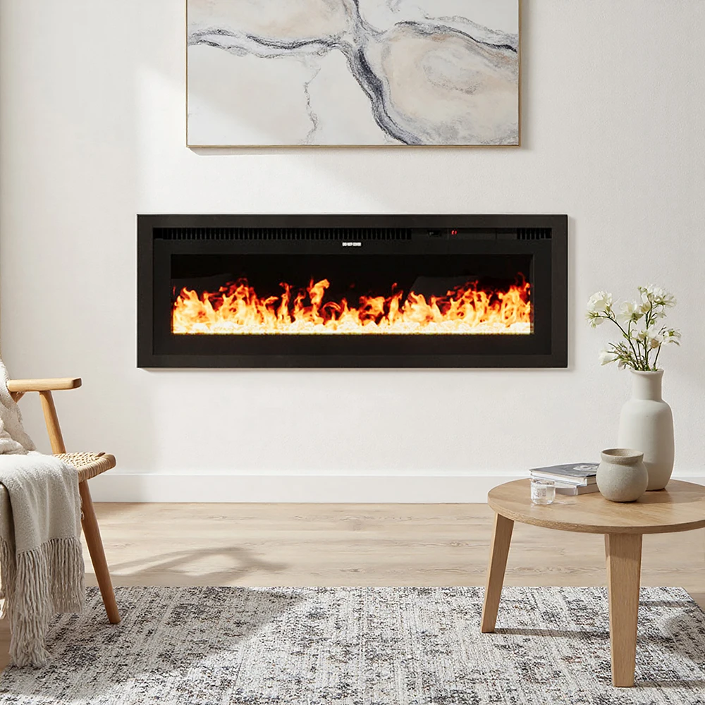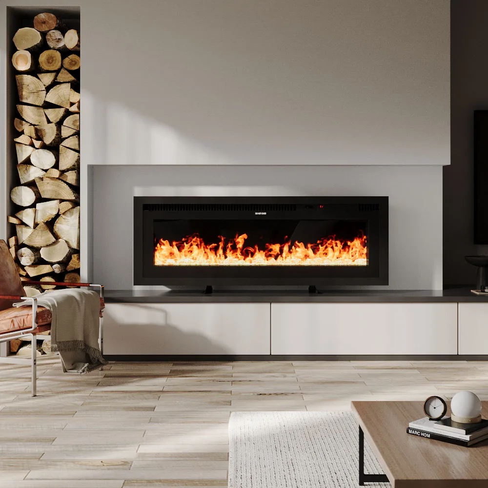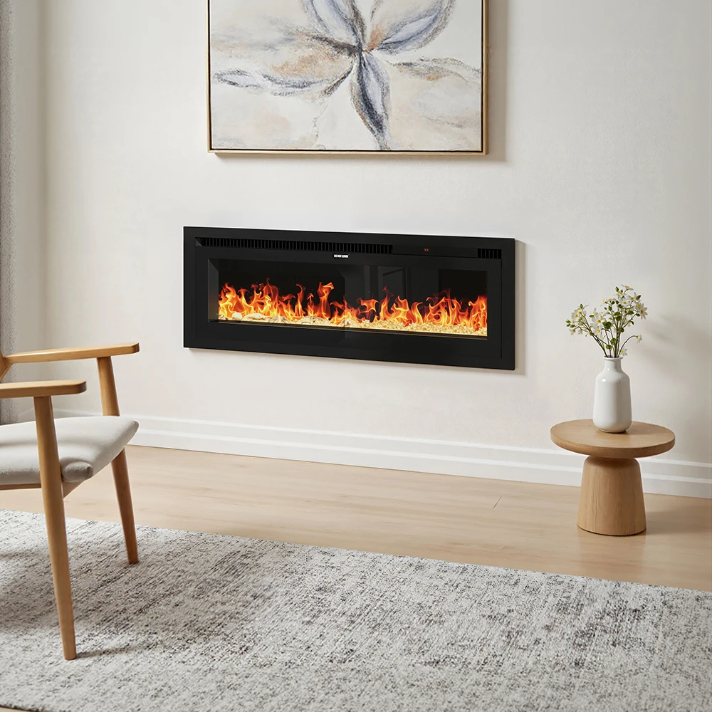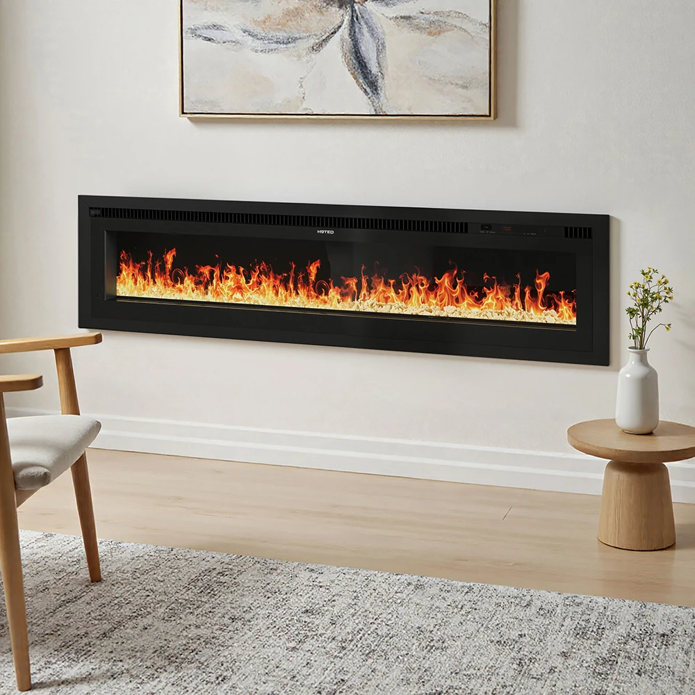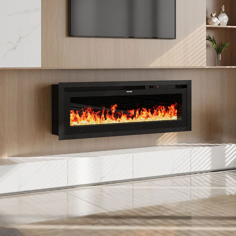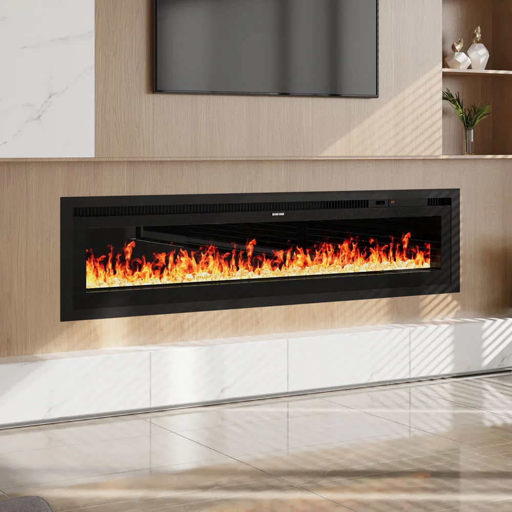Imagining that your living room features an electric fireplace radiating a warm glow on the night of a cold winter. This multifunctional electric fireplace is equipped with 12 vibrant flame colours, effortlessly creating a pleasant and romantic atmosphere. What is more, you can easily adjust the flame brightness across five levels, either with the remote control or by using the buttons on the glass panel of the fireplace. This flexibility allows you to adjust the flame by your personal preferences. Furthermore, the temperature control feature enables you to select a comfortable range between 62 and 82 degrees Fahrenheit, ensuring warmth fills the entire room. As night falls, you can set the timer to automatically shut off after 1 to 8 hours, saving energy while ensuring safety. Inside the fireplace, dazzling crystal stones shimmer in the flickering flames, adding a touch of luxurious decor to your living space.