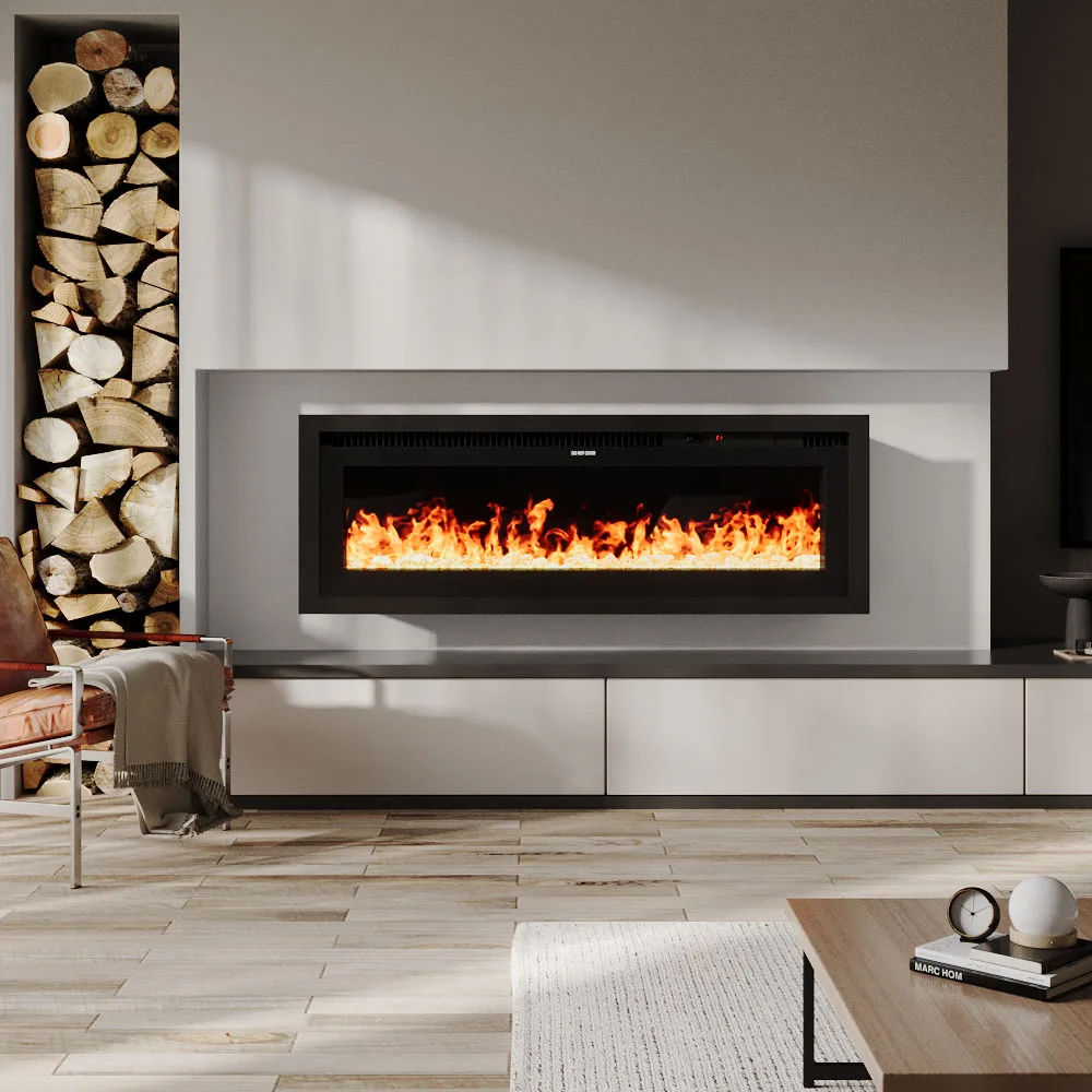 Three-in-one fireplace can be used standalone, recessed and wall-mounting