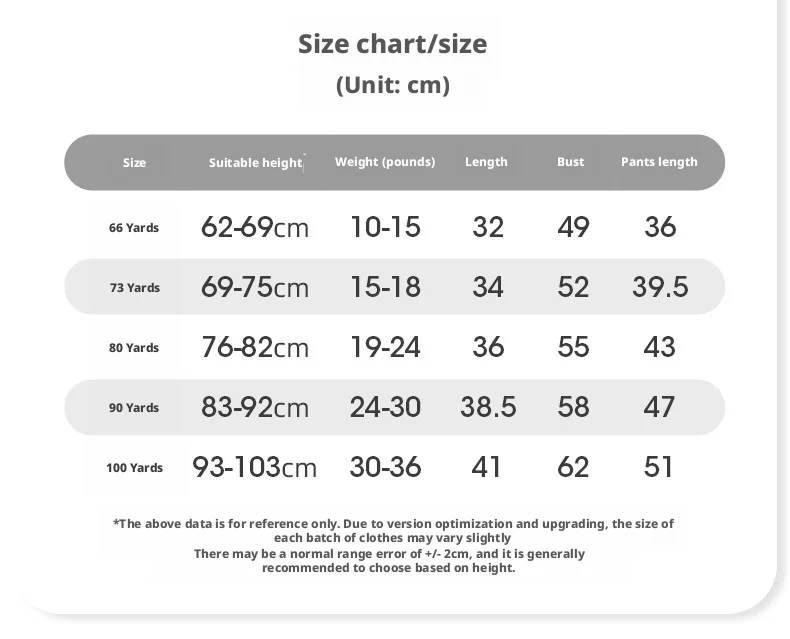 Size 100: age: 2-3 years old; weight: 15-17kg ; height: 95-102cm