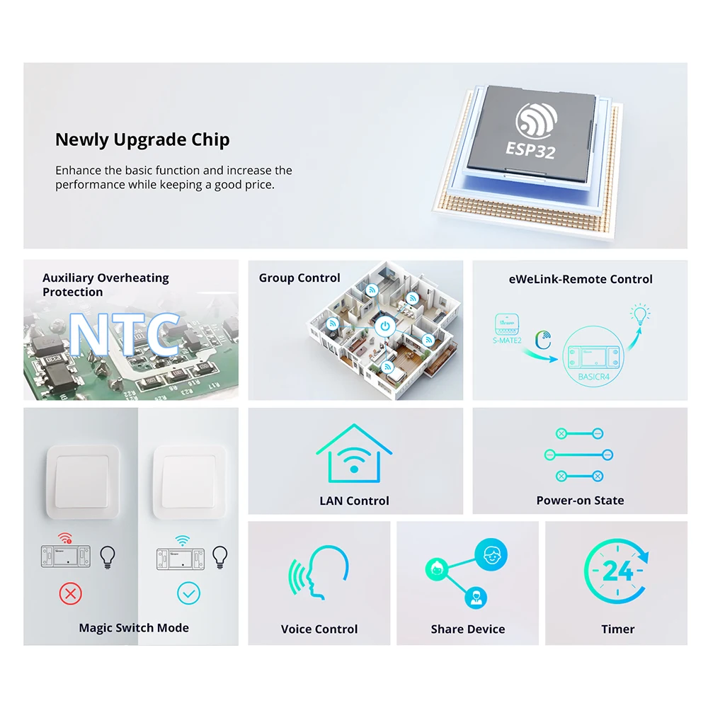 SONOFF BASICR4 Wi-Fi Smart Switch ESP32 Chip Reliable Safe Magic Switch Mode eWeLink Remote Control with S-MATE2 Alexa Google