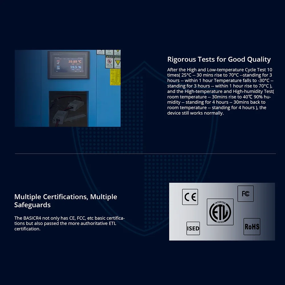 With the product’s built-in temperature sensor, the real-time maximum temperature of the entire product can be detected and speculated, which prevents the product from deformation, melting, fire, or live devices from exposure in case of over-temperature. The BASICR4 not only has CE, FCC, etc basic certifications but also passed the more authoritative ETL certification.