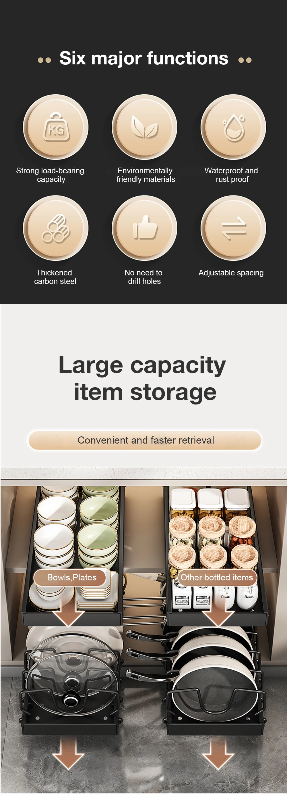The pots and pans organizer is made of high quality material, durable. The stability of the pull-out organizer will not be tilted by heavy pans, and the wobble-free organizer allows you to get in and out of pots and pans without worrying about the shelves moving or falling. Flexible to under cabinets, pantry shelves, deep drawers, and countertops, helping transform them into a neater space.
