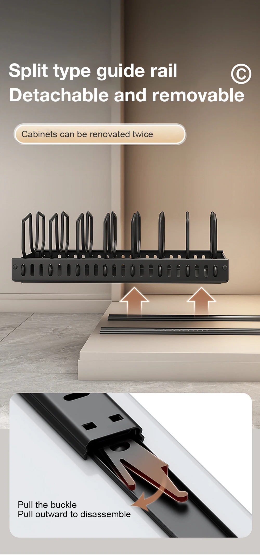 The pot and pan lid rack is designed with sliding rails and a built-in pulley ball, which makes it easy to organize and store your cookware with just one pull. The pan lid organizers comes with 2 strips of tape to secure the slides inside the cabinet, which protects the cabinet from drilling and damage, uick setup with no tools needed. Slide out pots and pans organizers make the most of your kitchen space, providing you with a more efficient and hassle-free experience.