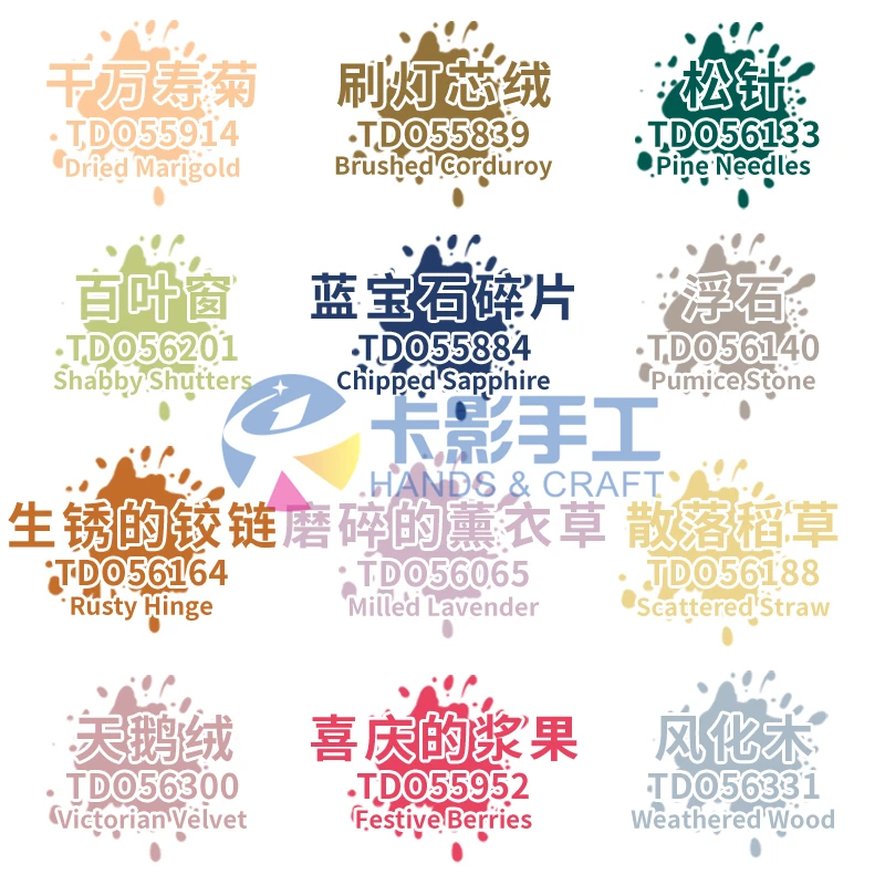| Color | brushed corduroy, chipped sapphire, crackling campfire, dried merigold, festive berries, kitsch flamingo, milled lavender, pine needles, prize ribbon, pumice stone, rustic wilderness, rusty hinge, salvaged patina, scattered straw, shabby shutters, speckled egg, spun sugar, stormy sky, tea dye, tumbled glass, victorian velvet, weathered wood |