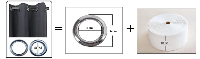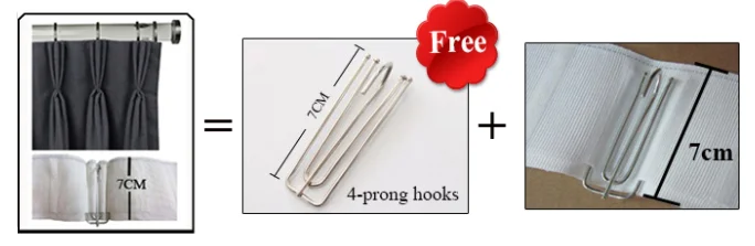 Style 1:Rings The inside diamter of Grommet is around4 cm,outside diameter is around 6 cm. · Suitable for curtain poles ·2 timesof the fabric is the suggested fullness. ![]() Style 2:Hooks Hooks curtain tape(7cmwidth) is sewed on the top of curtain panel.We provide 4 piece of 4-prong hooks per meter. ·Suitable for curtain poles or tracks ·2 timesof the fabric is the suggested fullness. ![]() Style 3:Pull Pleated Tape Pencil pleat(Tape 7cm) works better on fabrics that are not too thick.We provide 6 hooks per meter ·Suitable for curtain poles or tracks ·2.5 timesfabric is the suggested fullness.