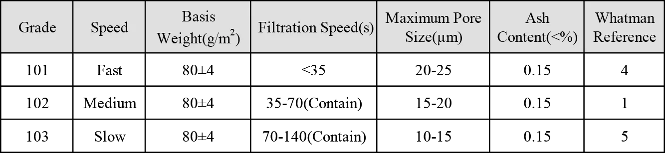 Filtration Speed(s): ≤35( The time for filtering 10ml(23±1℃)distillated water through 10c㎡ filter paper