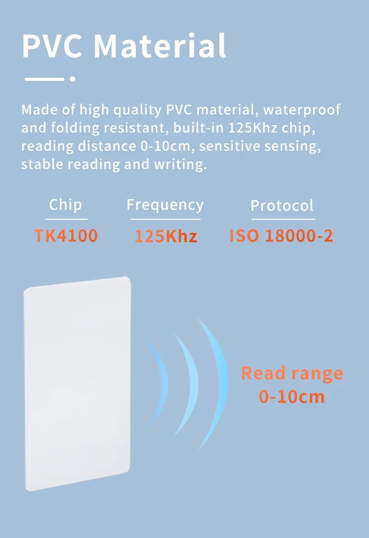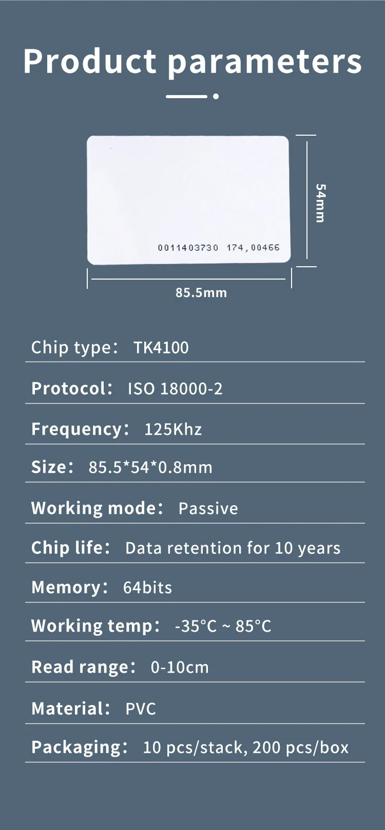 Each card is pre-programmed with a unique digit ID number (Number printed on the surface of the card), the ID number cannot be rewritten.