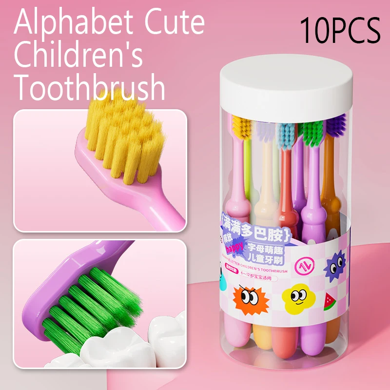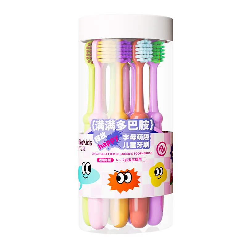 Description: Dopamine Children's Letter Toothbrush, designed for babies aged 3-12 years old, with soft bristles, gentle cleaning, rounded brush head, comfortable entry, mouth protection, anti slip handle design, comfortable grip. 22 hole high-density hair planting increases the contact area between teeth and effectively cleans dead corners in the oral cavity. Bundle hair planting, hydrophobic and easy to dry to prevent bacterial growth.