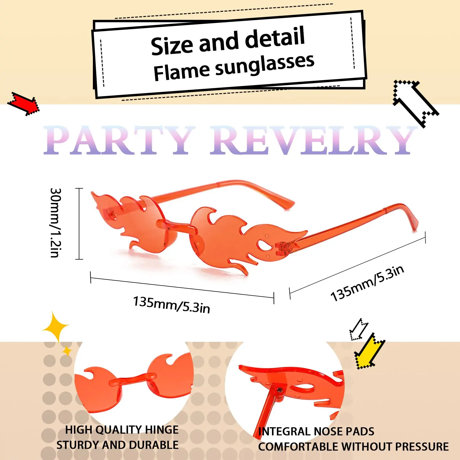 These rimless fire sunglasses are made of plastic, reliable and sturdy, will not easily break or fade, lightweight and skin friendly, and these fire outfits sunglasses all are with smooth border, which will not hurt your eyes, safe and comfortable for you to wear.