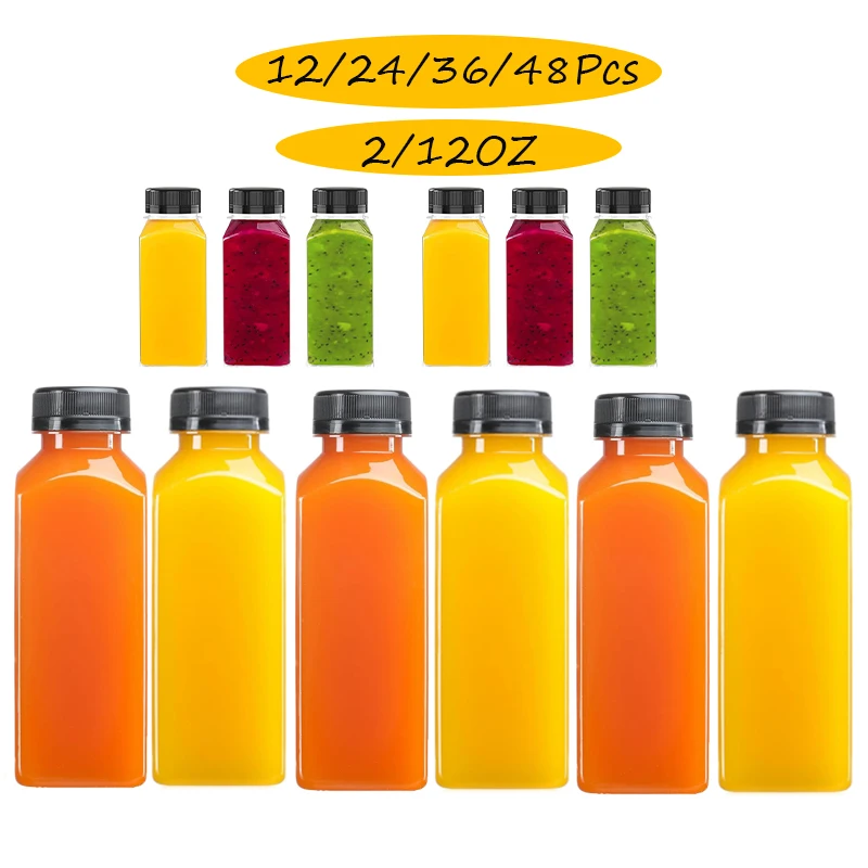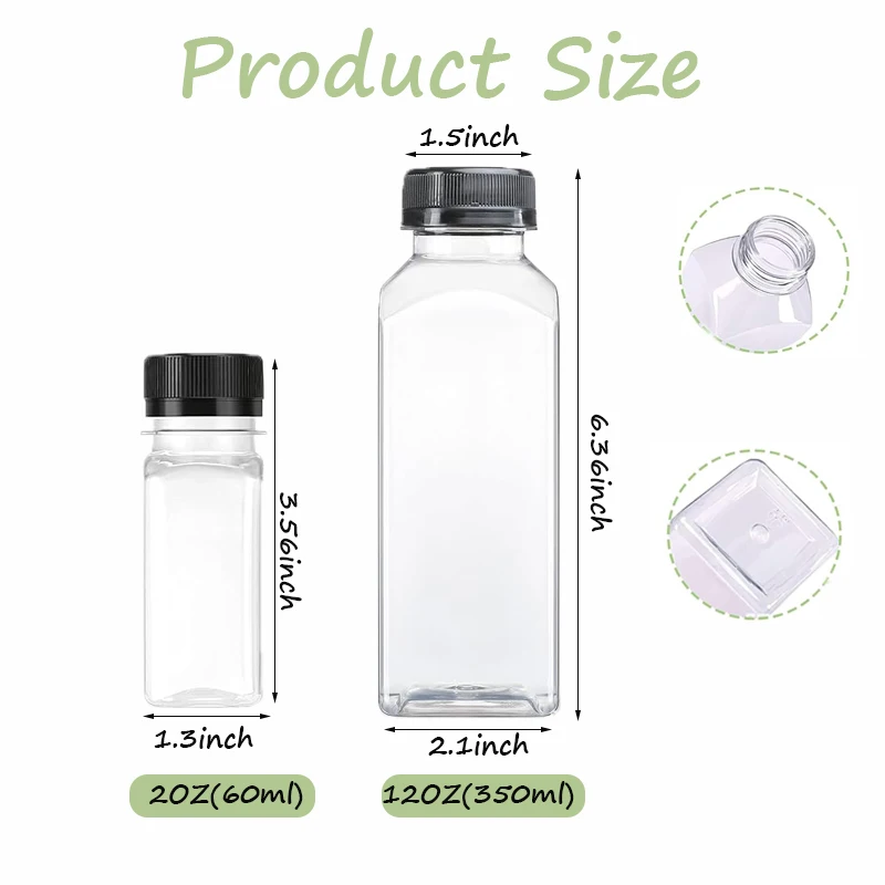 Available in black bottle cap transparent plastic empty bottles of 2oz (60ml) and 12oz (360ml), the square bottle design is beautiful and practical, with small and large capacities to meet different scene needs. The product is available in quantities of 12, 24, 36, and 48 and comes with a cleaning bottle brush. 2oz is suitable for children, and 12oz is suitable for adults.