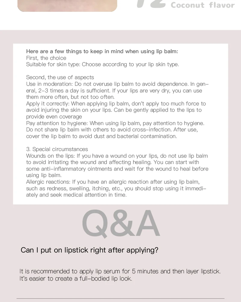 - Feature1: Prevent dryness and cracking, fade lip lines, and care for lips
