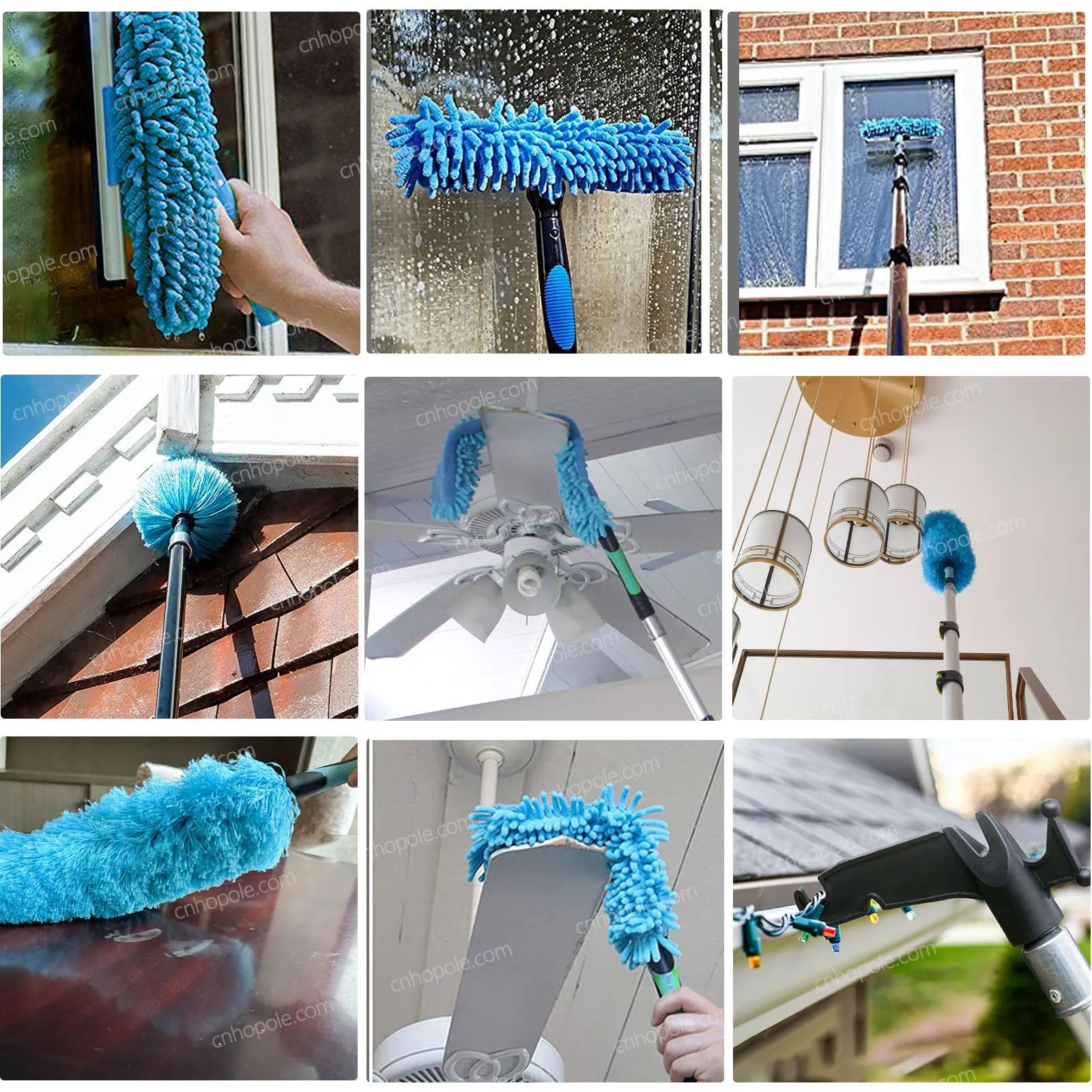 Cleaning Your House So Easily» the exterior duster and extension pole kit is designed to easily reach and clean all kinds of weird angles and surfaces. It includes 4 attachments: Multi-Angle Squeegee window cleaning tool,MicrofiberDuster- guaranteed effective dust removal while protecting your surfaces. Flexible Fan Blade Duster – perfect for conquering those hard-to-reach areas effectively! CobwebBrush – reaches into corners, ceilings, and skirting areas.