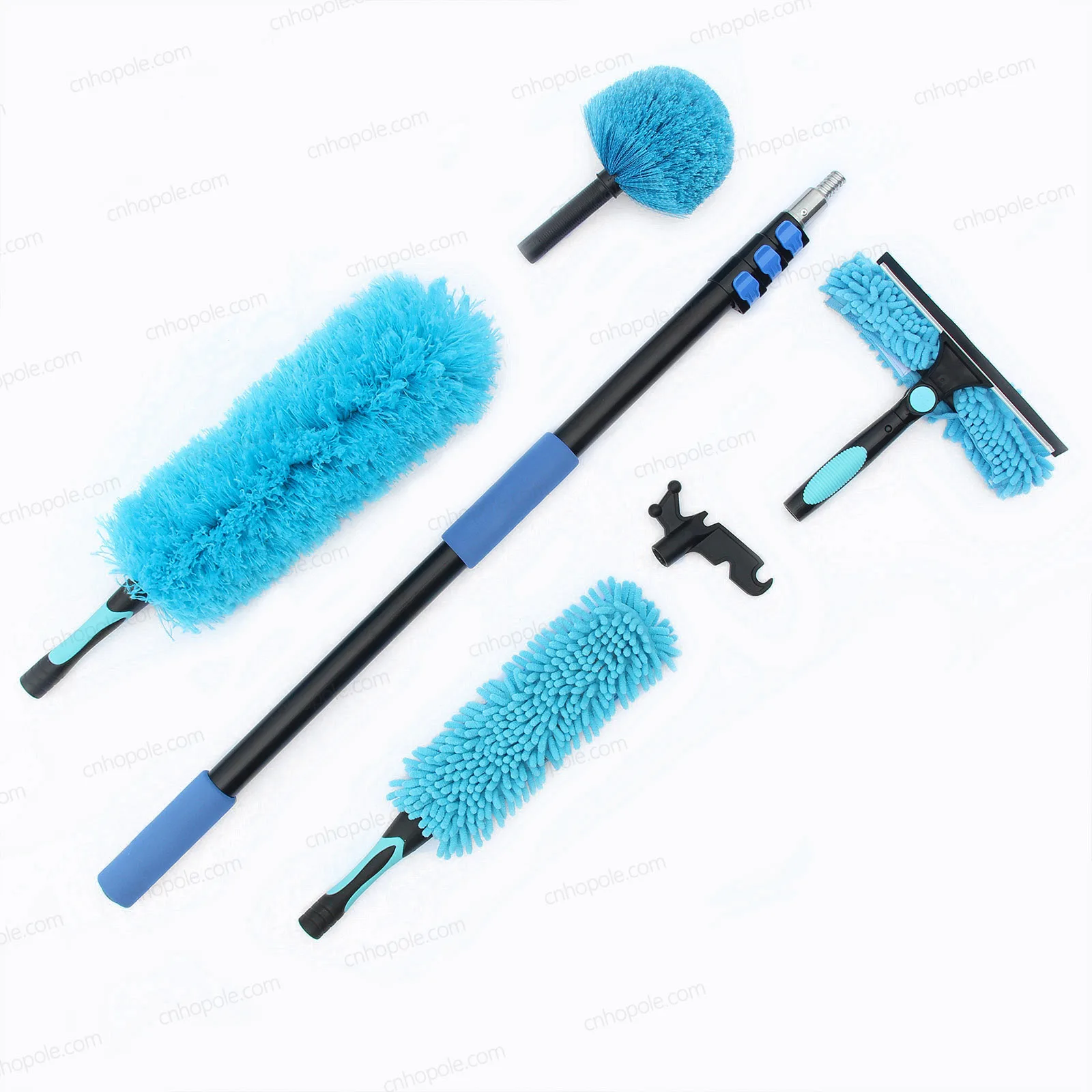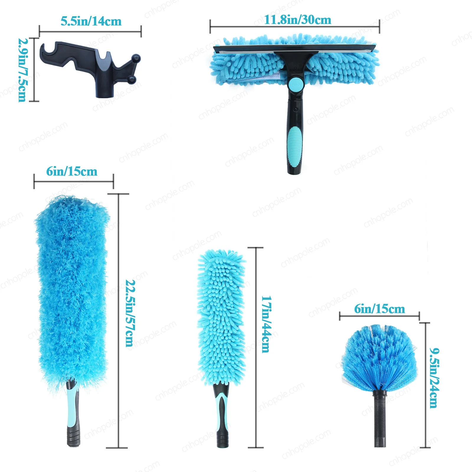 5-Piece ALL-INCLUSIVEKit for Household: extendable duster kit for high ceilings gives you up to 12 foot of reach, making all your hard-to-reach tasks super easy. This set includes a 10-foot extra-thick aluminum telescopinghandle, cobweb brush, microfiber feather duster,a flexible ceiling fan duster,a Scrubber & squeegee 2-in-1 combo,a multi-purpose hook. If your home has high ceilings, floor-to-ceiling windows, or other difficult-to-clean areas,our cleaning kit is the ultimate answer for a tidy home environment.