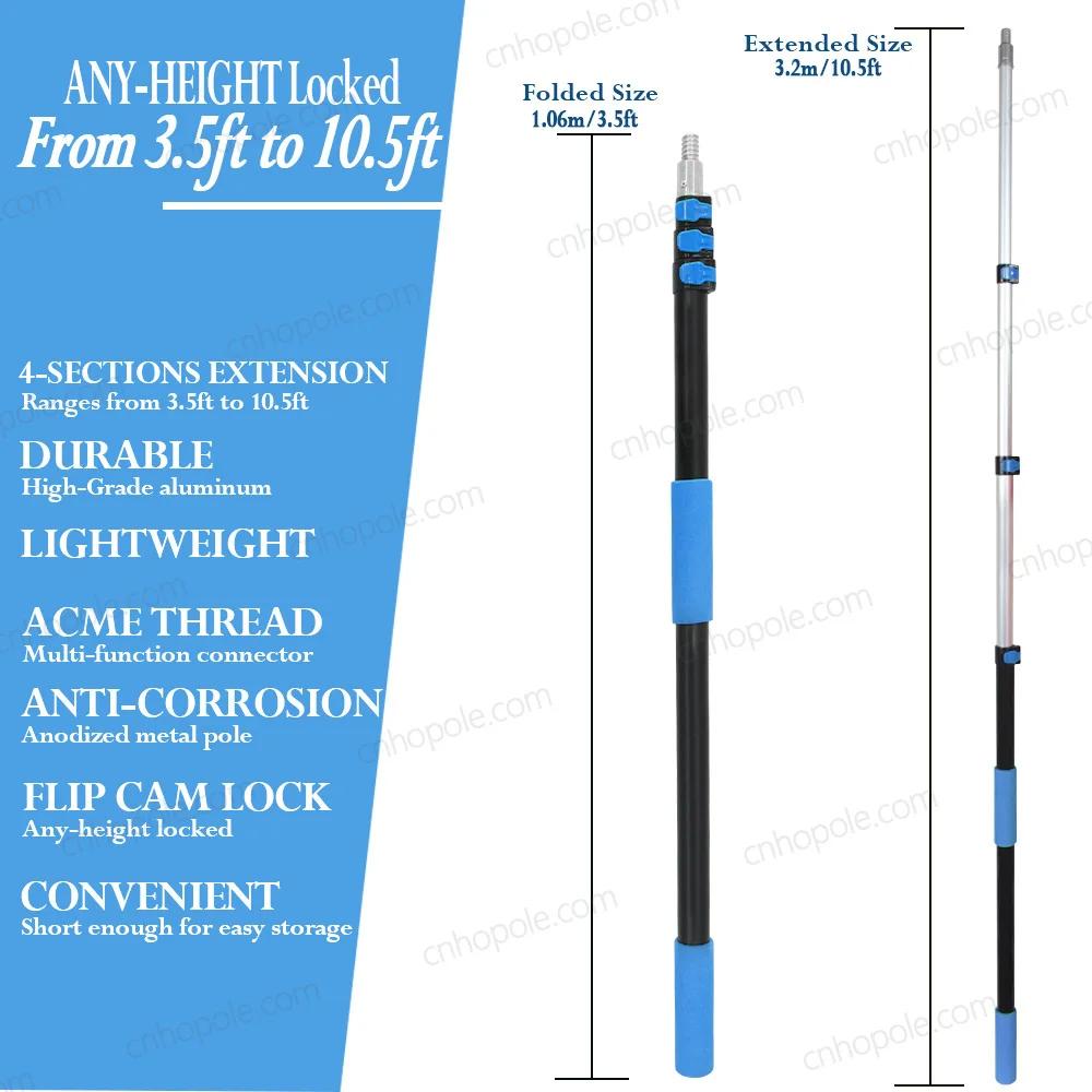 MULTI-FUNCTIONAL TELESCOPIC EXTENSION POLE » its universal attachment point fits nearly all cleaning accessories with ¾”ACME American thread: paint roller, fruit picker, light bulb changer, and more. A surprisingly short 3.5 ft retracted pole length comfortably fits in your car trunk for easy transportation and is easy to store indoors. The pole’s quick-release flip cam lock device for easy extension control, and its non-slip hand grips ensure maximal stability and a reliable grip.