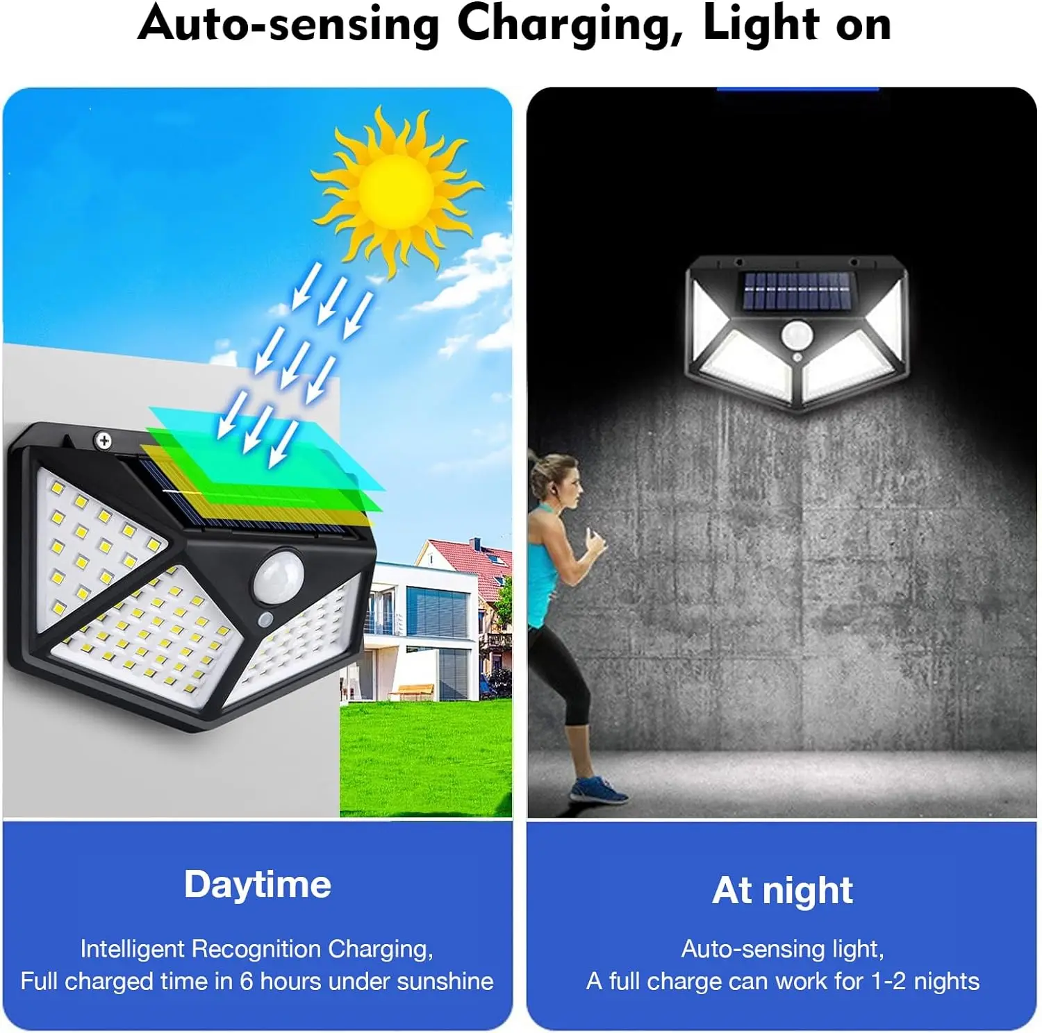 -the product charges in the day, auto turn on bright light in darkness or at night when motion is detected