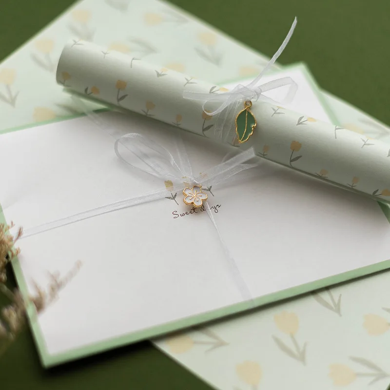 Packing List :4pcs letter pads +2pcs envelopes+2pcs stickers+2pcs pendants+2pcs 100cm white chiffon ribbons