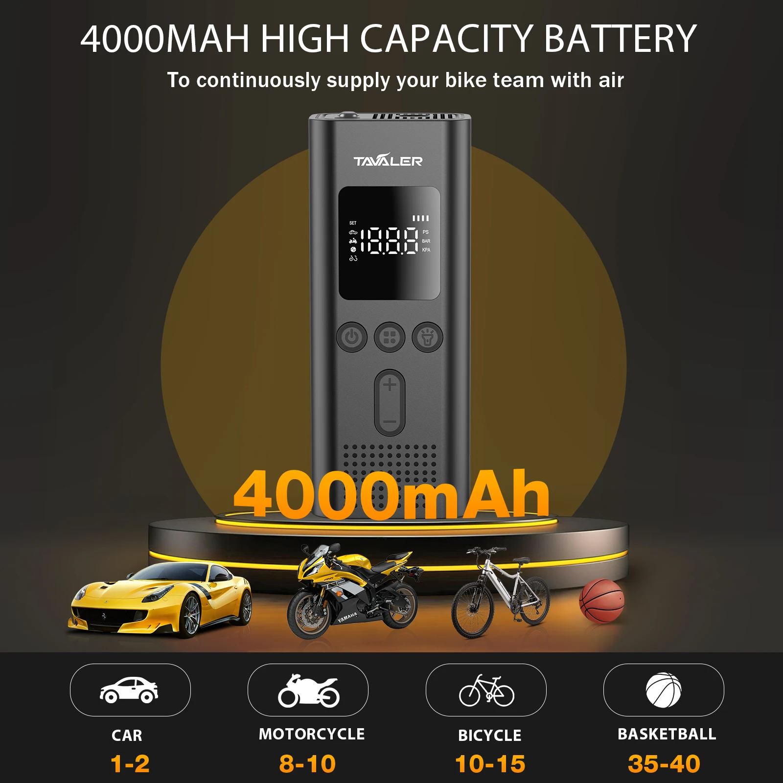 TaValer electric air pump can quickly increase the tire pressure of a car from 1.93 Bar to 2.3 Bar (28 PSI to 34 PSI) within one minute (specification: 175/65R14 82T). Within 2 minutes, the tire pressure of road bikes can be raised to 100 PSI, and the maximum output pressure can reach 150 PSI.