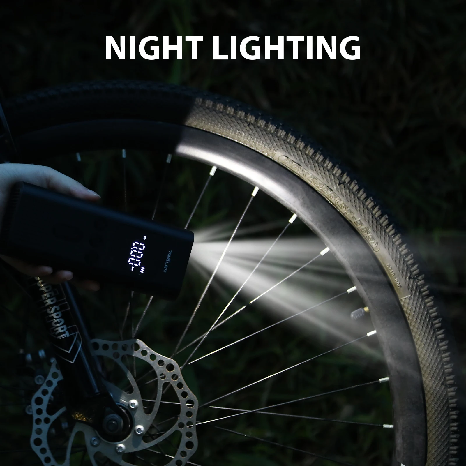 The electric inflation pump is equipped with a flashlight illumination function, which improves visibility at night and can also be used as maintenance lighting.