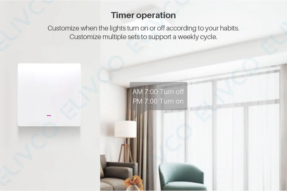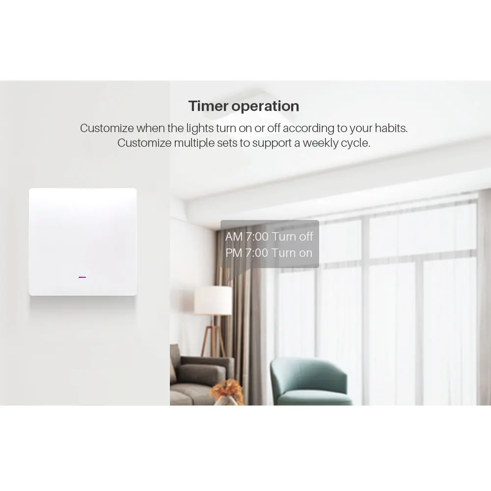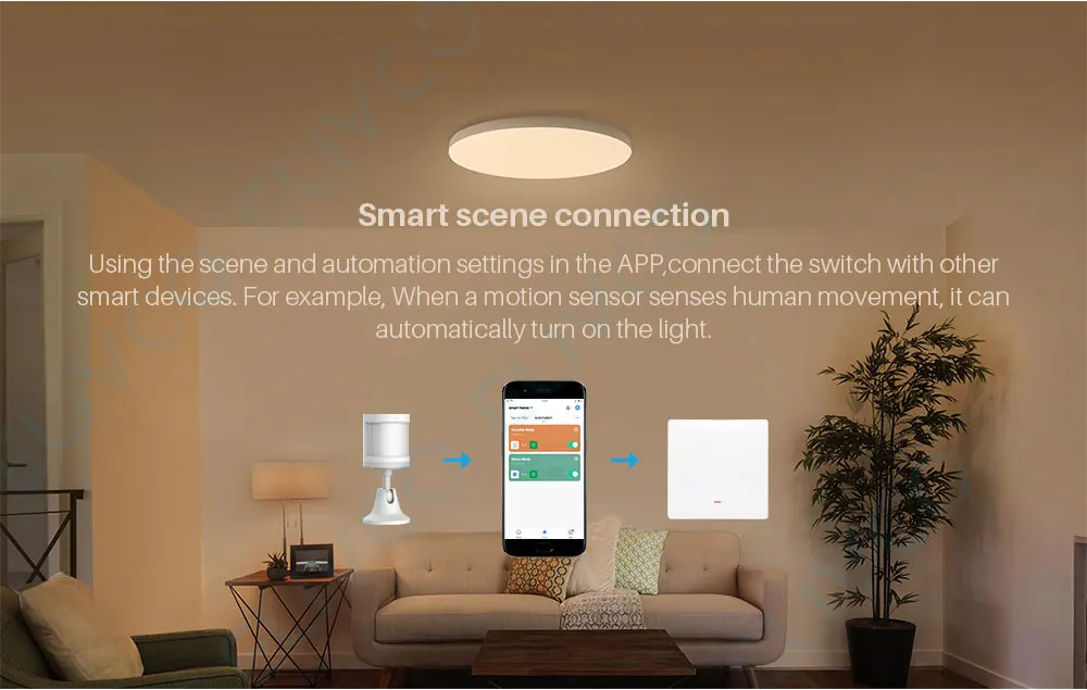 Using the scene and automation settings in the APP,connect the switch with other smart devices. For example, When a motion sensor senses human movement, it can automatically turn on the light.
