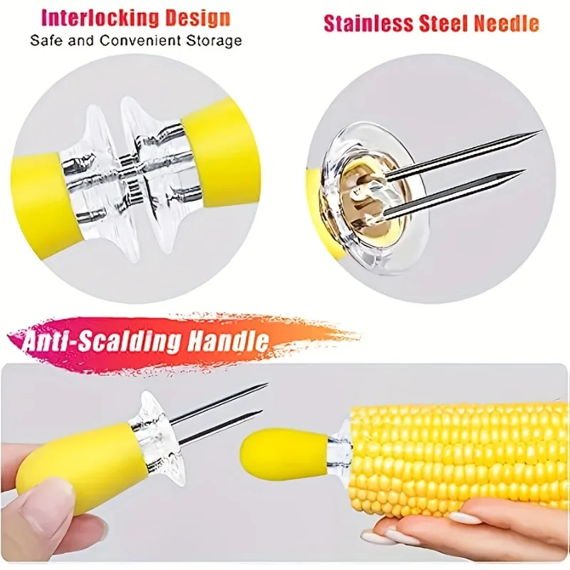 Safe and Convenient Interlocking Design: Each pair of corn cob holders boasts a secure interlocking design. By overlapping them, you can conceal the sharp stainless steel pins, ensuring safe storage and preventing accidental injuries. The holders easily snap together when not in use, providing a tidy and space-saving solution.