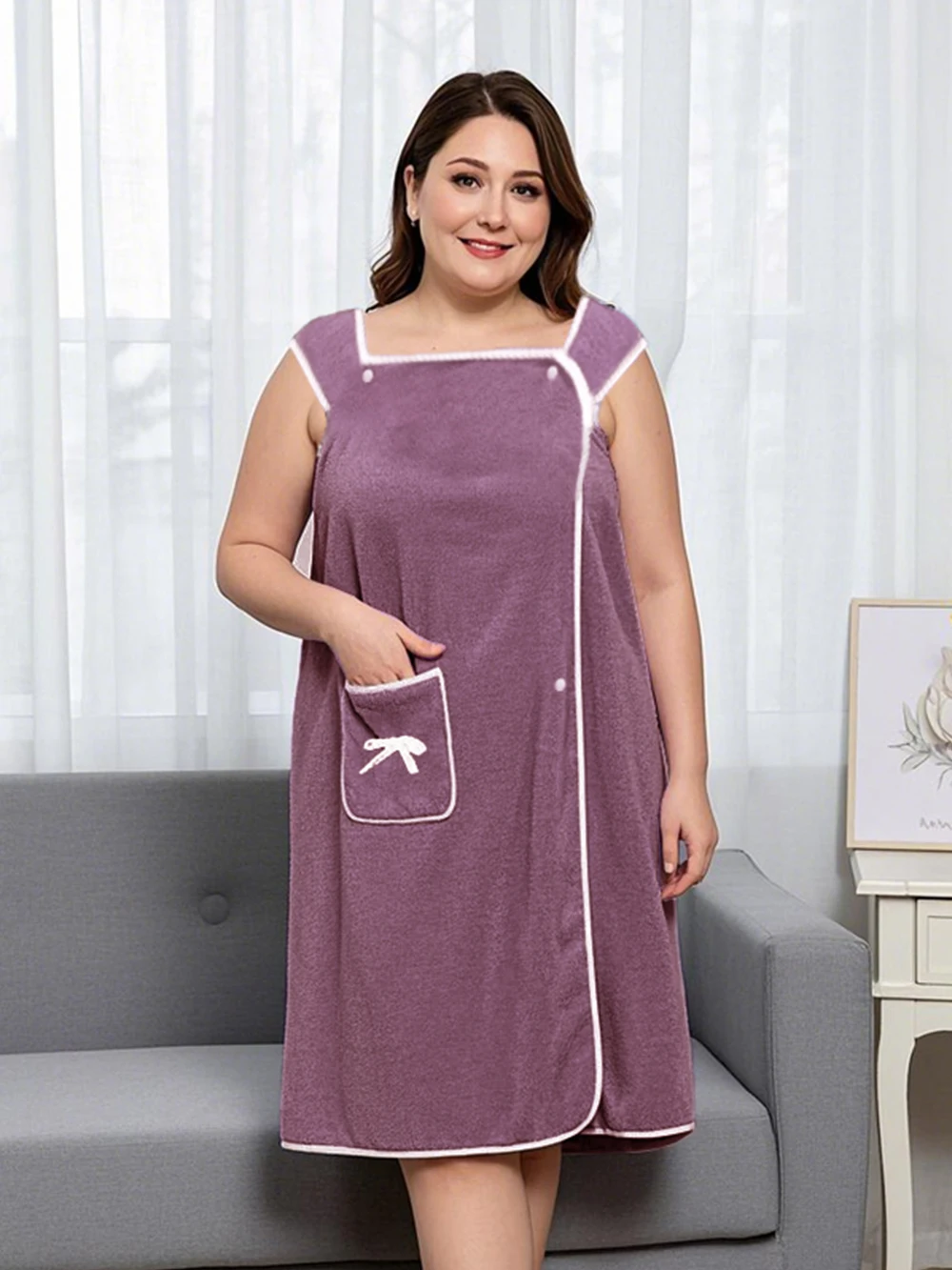 1 Piece Adjustable Women’s Plus Size Bath Robe, Cute Bow Wearable Bath Towel Skirt with Pocket for Home Bathroom