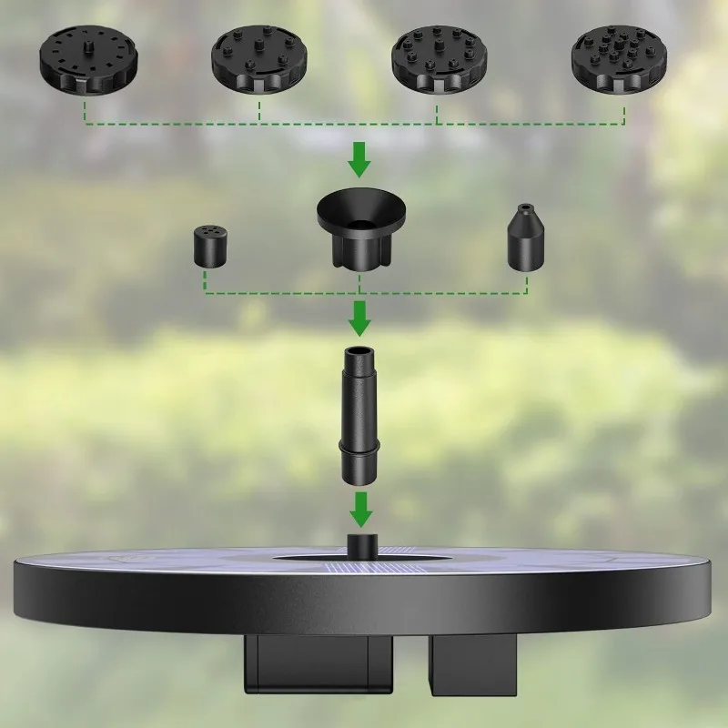1W/1.5W/2.5W Outdoor Solar Fountain Suitable for Garden Pond Solar Fountain Pump Kit with 6 Nozzles for Garden Decoration 【2.5W Solar Bird Bath Fountain】 With high-tech solar chips, Solar Bird Bath Fountain can better absorb sunlight. The better the angle and intensity of the sunlight, the more exciting the effect of the fountain will be. The height of the fountain can reach 25 inches, and it will stop working at night. 【Environmental Protection and Energy Saving】Completely controlled by solar energy, The solar panel required no batteries or electricity.When the panel receives sufficient sunlight, the water pump will start up and start working within 3 seconds. It is more environmentally friendly and safer to use by converting it into electricity. 【6 Types of Nozzles】The solar fountain is equipped with 6 nozzles, each nozzle has a different spray height and spray pattern. You can choose your favorite nozzle type according to different scenes. 【Multi-Scenario Use】2.5W solar fountain pump sprays in silent mode, making less sound when working. The fountain is perfect for birdbaths, small ponds, swimming pools, aquariums, garden decorations, circulating oxygen water, bird baths, attracting more hummingbirds to your yard. 【Suggestions for Use】 It is necessary to keep the water clean and clean the water pump regularly to avoid dirt from clogging the water pump.