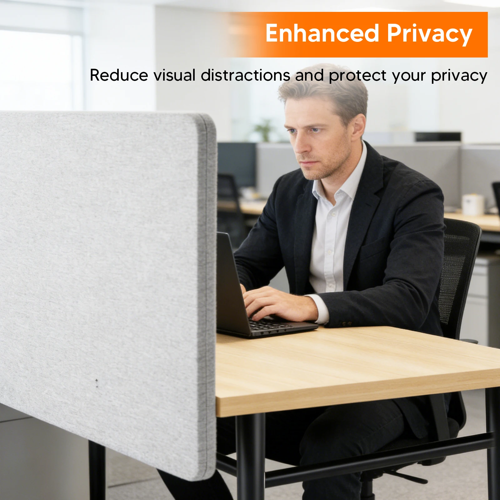 Features: 1.Enhanced Privacy: The 61.02×23.62 inch desk divider privacy panel effectively reduces visual distractions and safeguards your privacy. Elevate your focus and productivity by creating a more secluded workspace for office, study, or leisure. 2.Premium Materials: Featuring a double-layer soundproof board wrapped in linen, this office desk partition offers impressive durability and wear resistance. It helps build a quieter, more focused work environment for optimal efficiency. 3.Effortless Clamping: With pre-drilled installation holes for adjustable height and two included C-shaped clamps, the cubicle partition panel is easy to secure. Simply clamp it onto any flat desk surface for instant setup. 4.Personalize Your Area: The workstation privacy divider uses a pin- and sticker-friendly material, letting you display photos, to-do lists, and motivational quotes – making your workspace unique and inspiring. 5.Versatile Application: The neutral-toned desk privacy panel blends seamlessly with varied settings. Ideal for offices, libraries, schools, and more, it enhances privacy wherever you need focused attention. Specification: