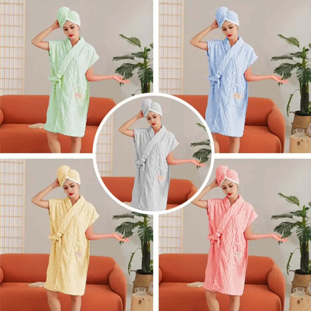 2-Piece Wearable Bathrobe & Hair Towel Set – Quick-Dry Microfiber with Pocket & Solid Color Shower Skirt for Spa Salon Home Use