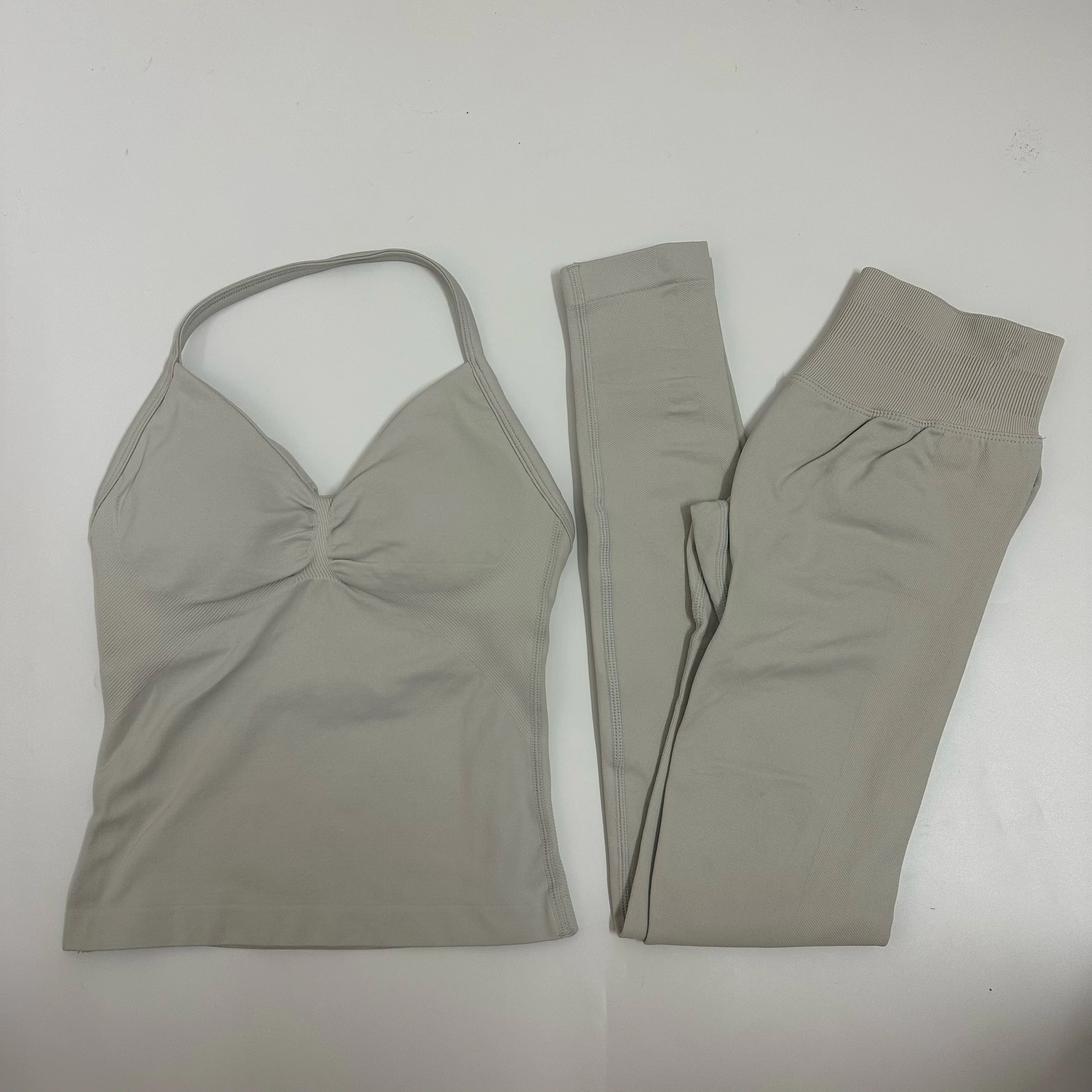 There are none on these sets; I’ve already ordered twice and also ordered the tops separately. Basically, I’m a size L/M, but the M leggings fit better and really shape the body. The color that arrived is really nice, but it’s not brown; it’s more burgundy.