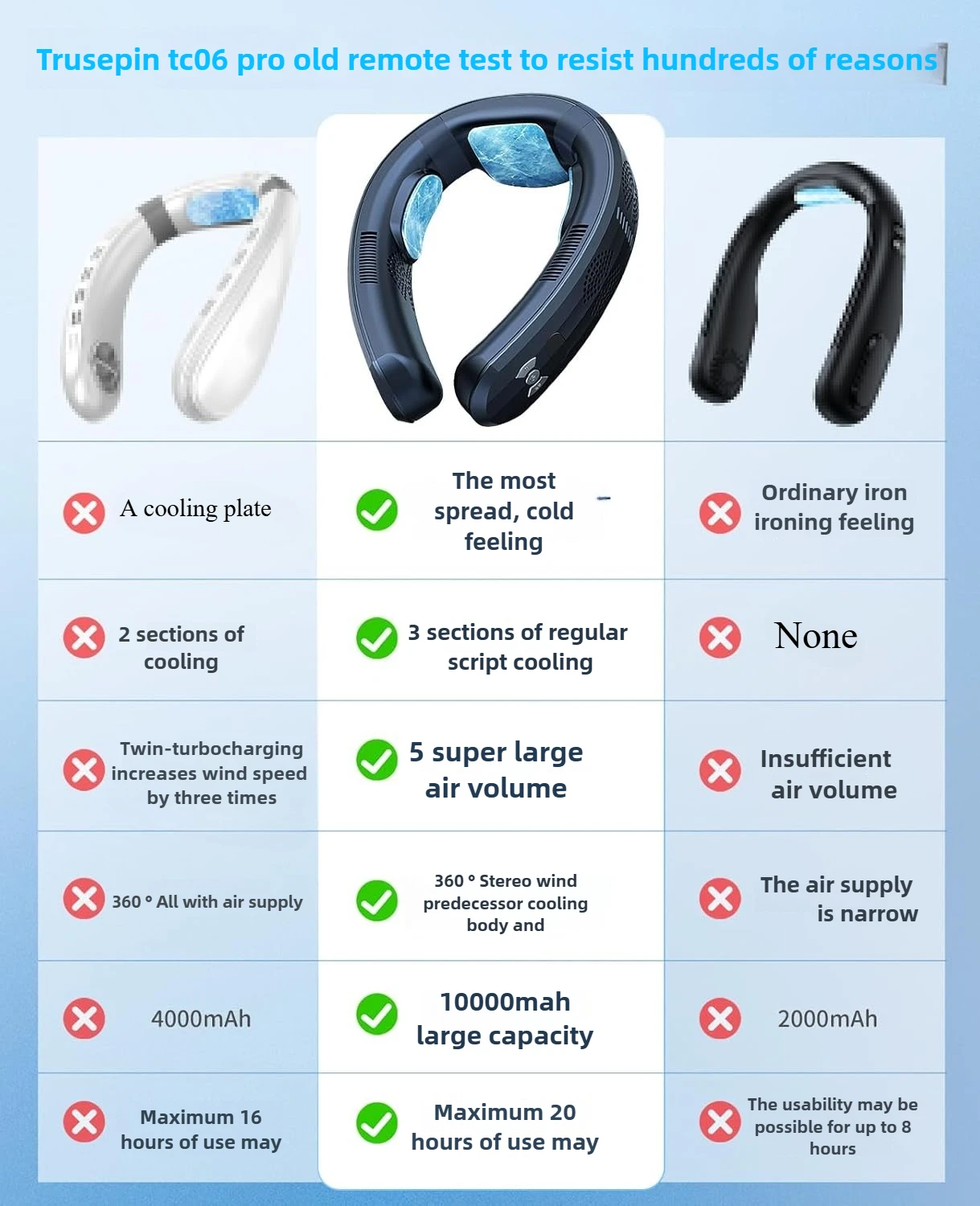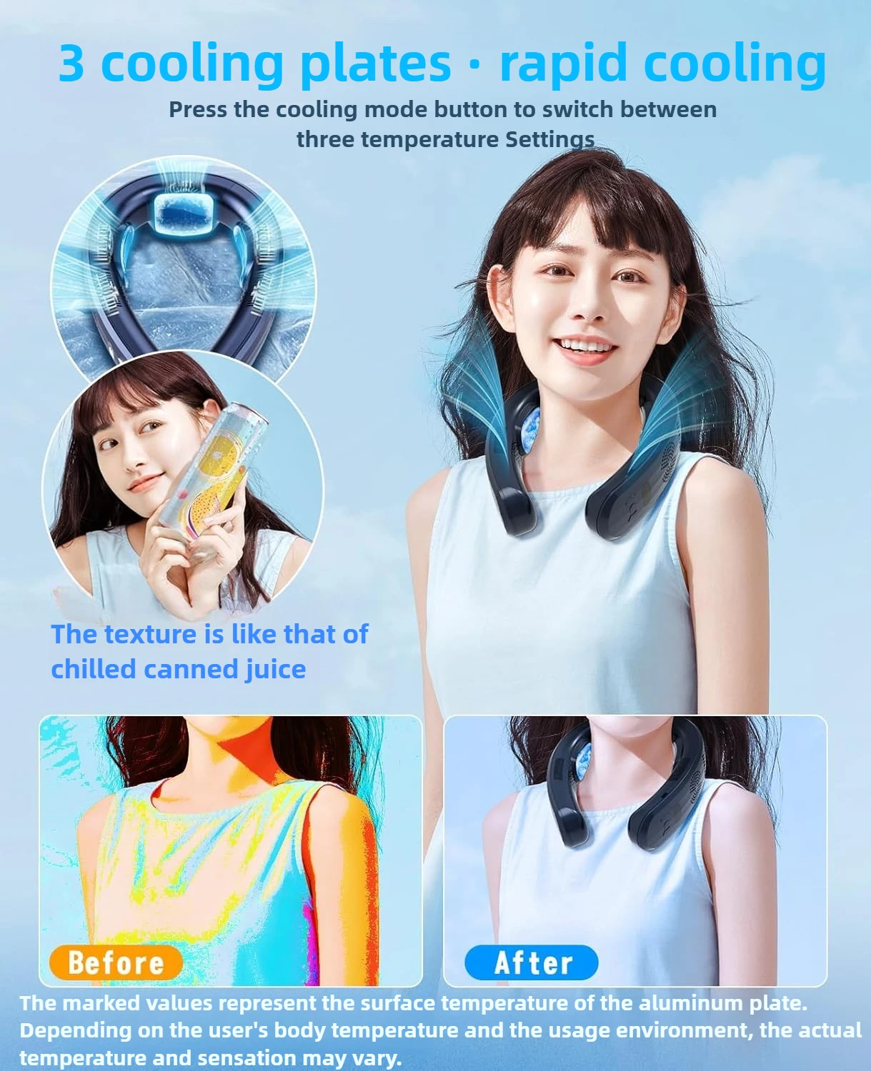 In order to reduce noise, this halterneck fan reduces the intensity of the fan outlet, so its air volume will not be very strong, mainly relying on and cooperating with the refrigerant of the semiconductor to produce the cold feeling caused by the feeling of ice (if you can't accept it, please don't buy and return it), and it can also be heated, and it can also be used in winter