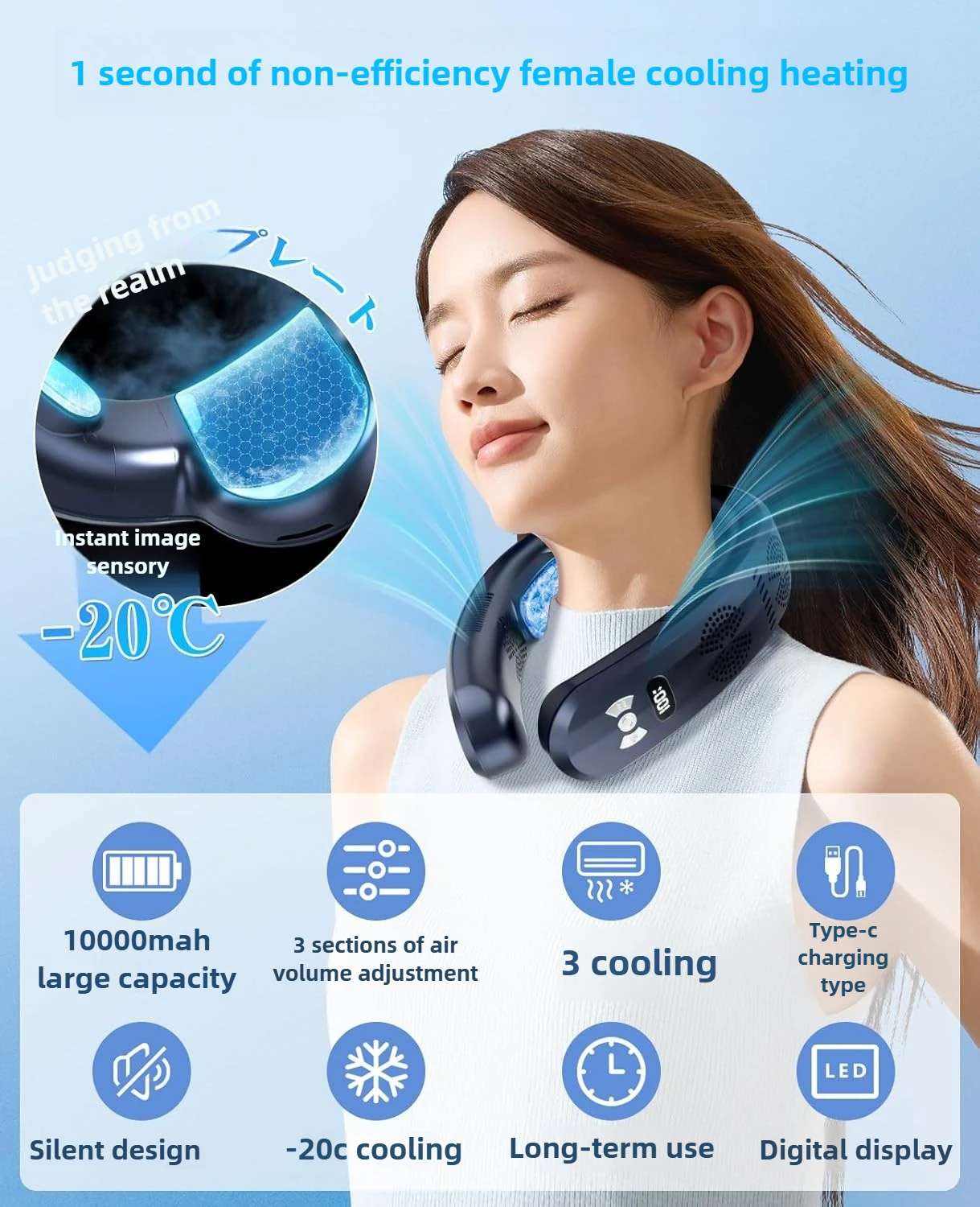 🧊[10000mAh large capacity battery, long-term use] The industry-leading large capacity 10000mAh lithium polymer battery thoroughly supports your active life! It can be used continuously for up to 20 hours (weak mode only), so you can be fully active from morning to night without power shortages. Adopts Type-C PD compatible 18W ultra-fast charging, and is fully charged in just 2.5 hours! Even if you charge it for a short time before going to work on a busy morning or before going out suddenly, you can secure enough power. Another revolutionary feature is the design that allows you to use it while charging. It works stably even when connected to a mobile battery or PC, so you don't have to worry about it running out when you're traveling or on the go. Say goodbye to days of frustration due to running out of charge! It also comes standard with a reliable battery protection function (overcharge/overdischarge/short circuit prevention). Even after long-term use, it minimizes battery deterioration and significantly extends the product life. *The continuous use time varies depending on the remaining battery level, usage method, usage environment, etc. Please be aware of this in advance. 🧊 [3-stage adjustable/LED display display] This neck cooler is equipped with an LED display, so you can immediately see the wi