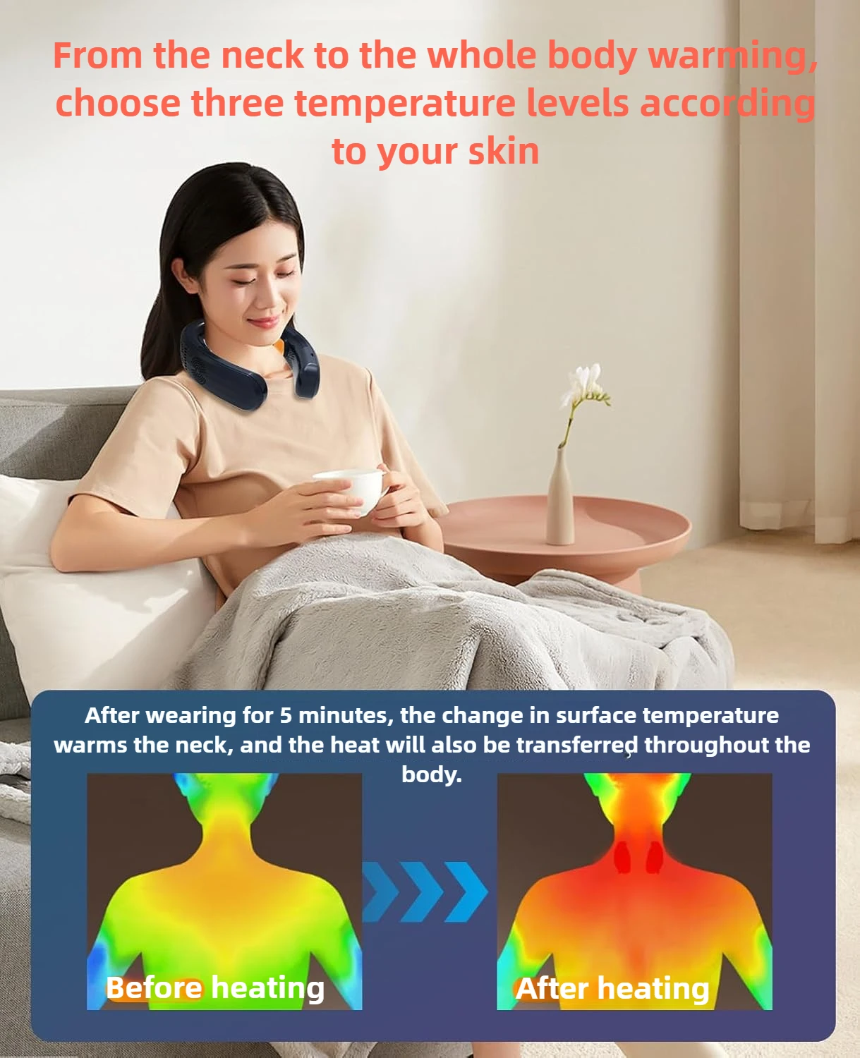 🧊[Introducing the industry's first "ice and fire" neck cooler!] Our neck fan has a 3-way function with 3-stage airflow mode, 3-stage cooling mode and 3-stage heating mode, so you can use it all year round regardless of the season. The upgraded cooling plate at the back of the neck achieves a 150% expansion of the cooling area, far exceeding the industry standard. The aluminum plate with high thermal conductivity and reflectivity starts heating and cooling instantly, and you can feel cool and warm in about 1 second. The temperature is rapidly cooled to MAX-19°C, and the cool feeling of a cold can is transmitted from the neck to the skin, so you can stay comfortable even in the heat of summer!