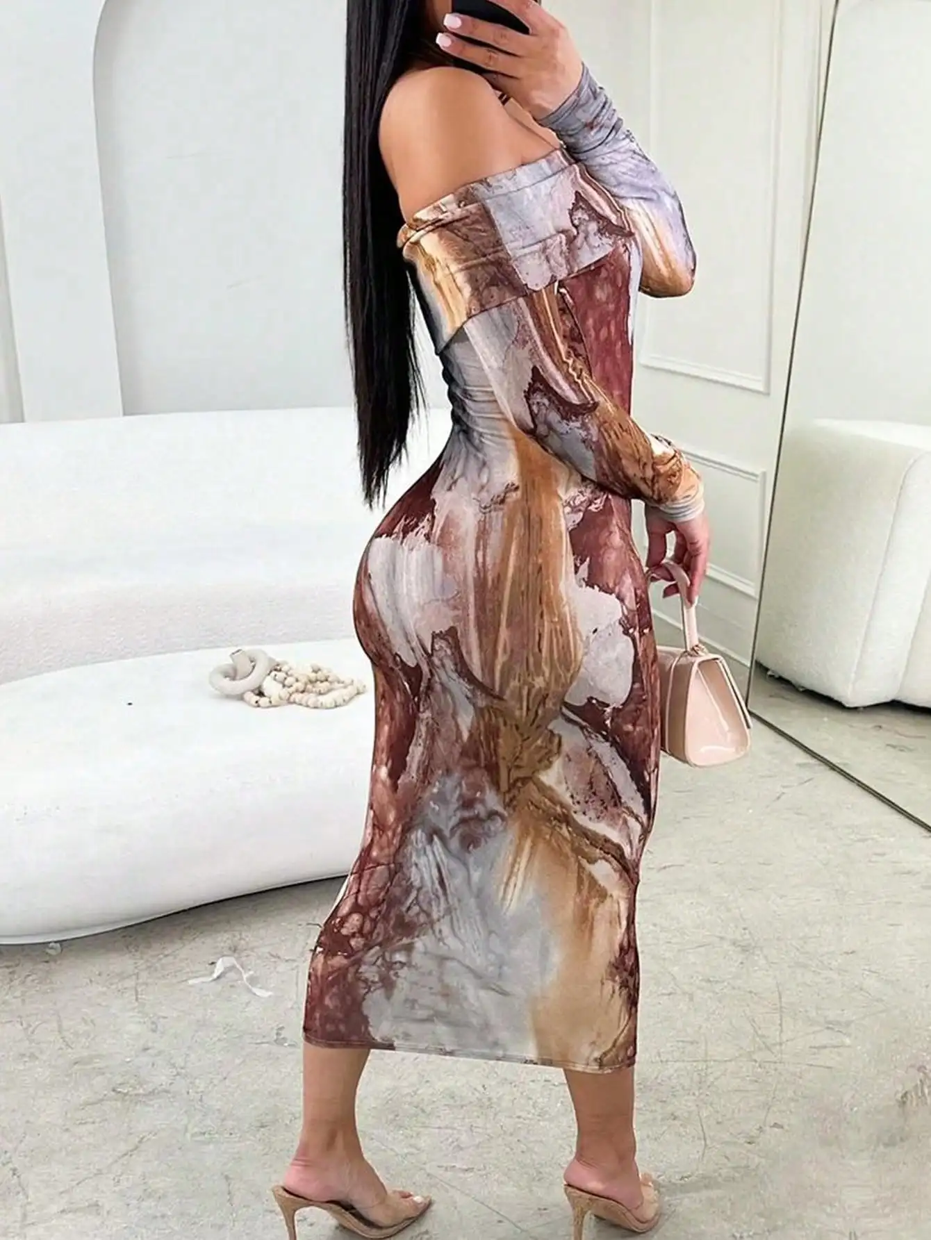 2025 Retro Print Dress Women’s Sexy One-Shoulder Long Sleeve Bodycon Midi Dress Vintage Floral Step Hem Party Clubwear