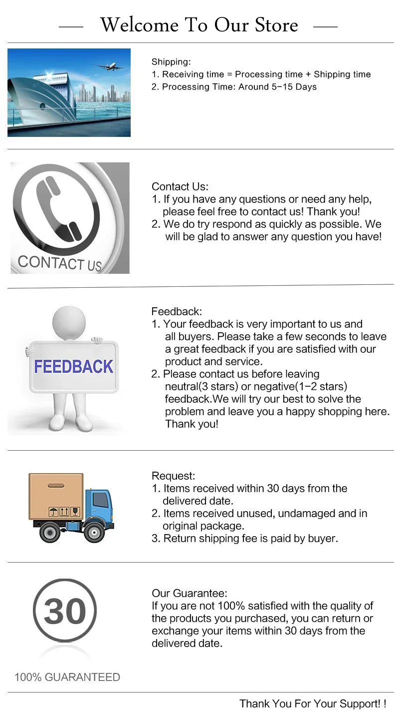 4.Normally we can send your order within 3 days after the payment, If not, please contact us to check the problem.