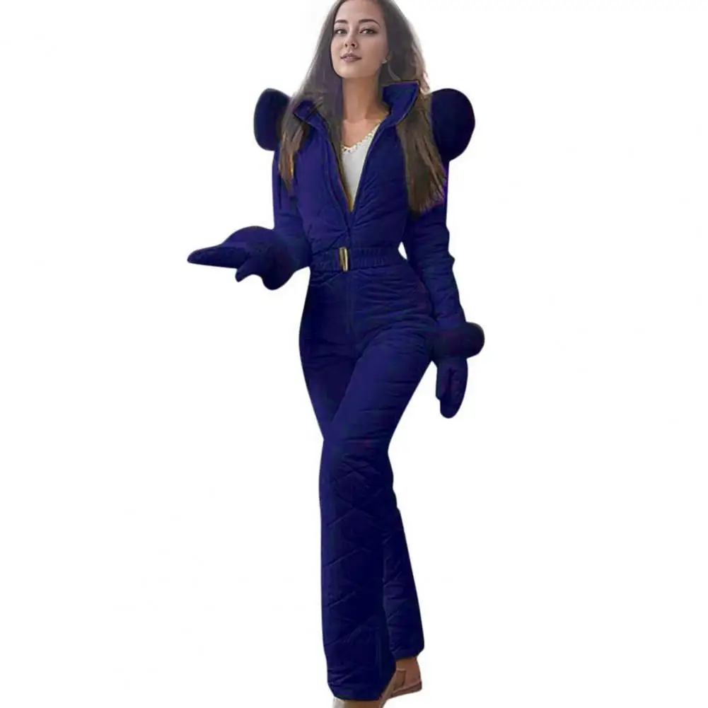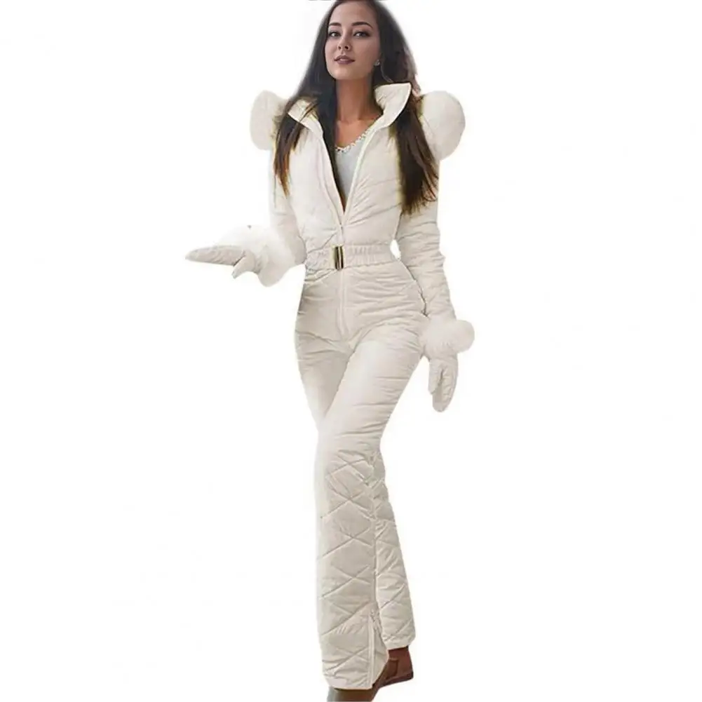 Women Winter Jumpsuit with Gloves Elastic Waist Thickened Padded Snowsuit Hooded Zipper Closure Windproof Outdoor Ski Outfit Waterproof Ice Snow Sports Jacket