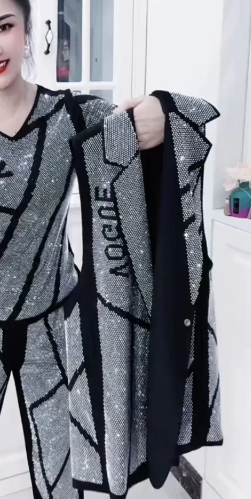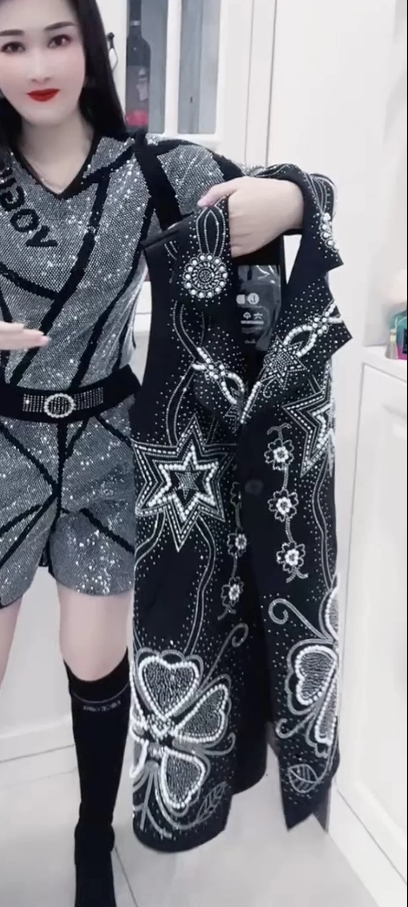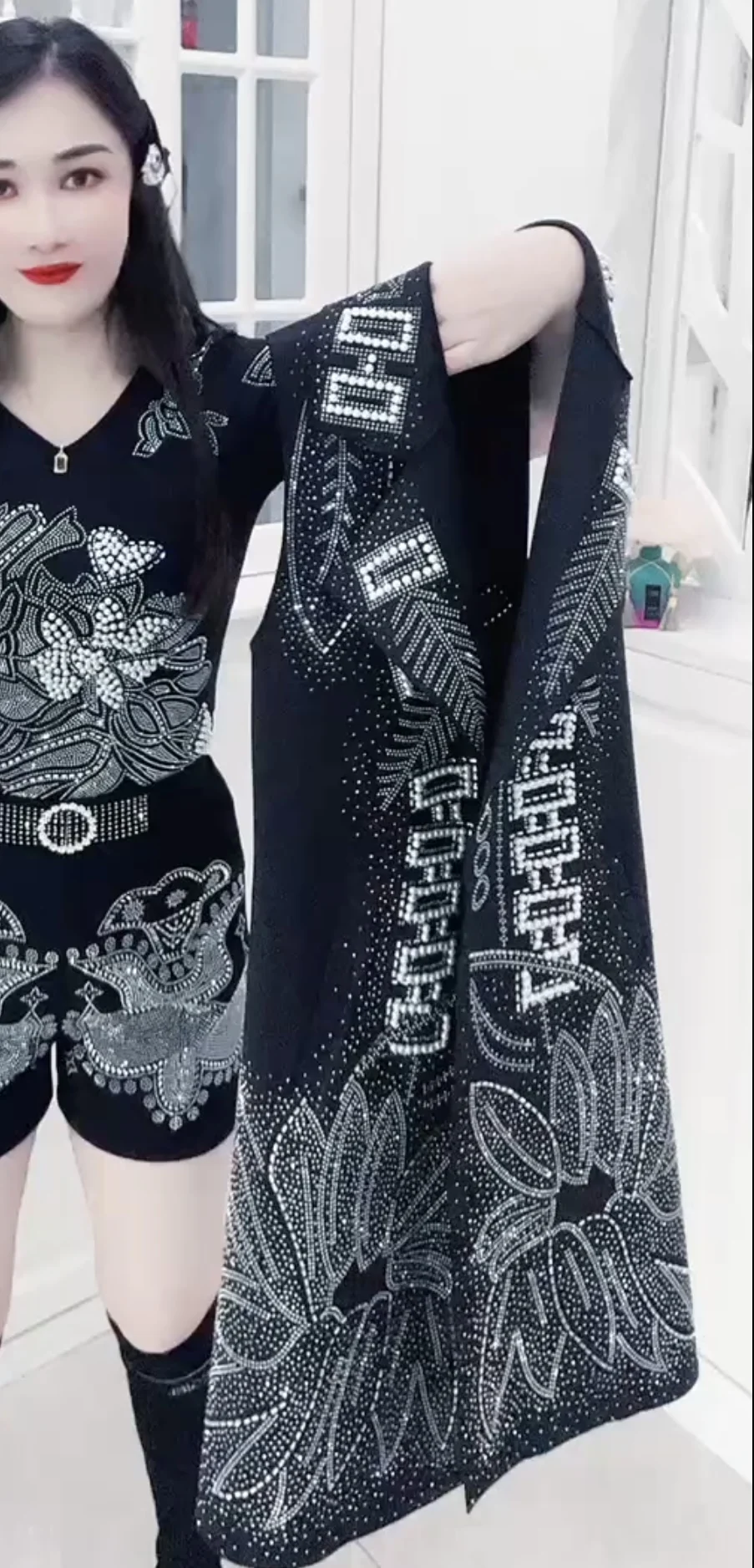 The top features exquisite rhinestone embellishment, adding a touch of glamour and sophistication to your look.