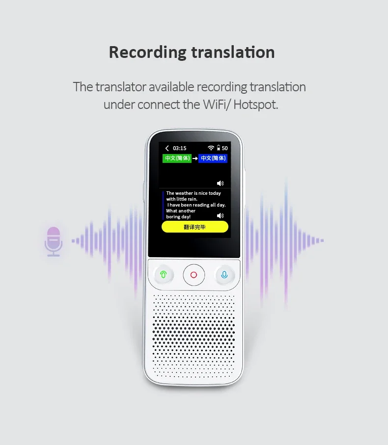 Feature:1. [More Convenient] Real time two way translation supports 137 languages, translates voice and reads aloud, face to face universal translation and call translation, more accurate and convenient than cell phone APP. 2. [WIFI Connection and Long Battery Life] Connect to WIFI or hotspot, no SIM card required, no APP to download, start real time translation immediately. Mini design, easy to carry, high capacity (1500mAh) battery supports more than 3 days standby time. 3. [Multiple Languages] Offline translation function, supports offline English (US), Russian, German, Italian, Japanese, Korean, French, Simplified Chinese, Traditional Chinese, etc. Two way translation (for emergency use only) 4. [Optimized Recognition] The translated content is displayed on the 2.4 inch touch screen, read aloud, optimized for OCR (character recognition) recognition of handwritten text, image translation, files, menus. 5. [Wide Application] Widely used for travel, shopping, meeting, entertainment, making friends, learning foreign languages, etc., as well as for foreign signs, road scene signs, restaurant menus, product labels and entry cards, etc. 6. [Easy to Use] Convenient for the elderly and children to use. There are only three buttons, the interface icons are refreshingly simple, easy to use for both young and old (Note: please fully charged before the first use).
