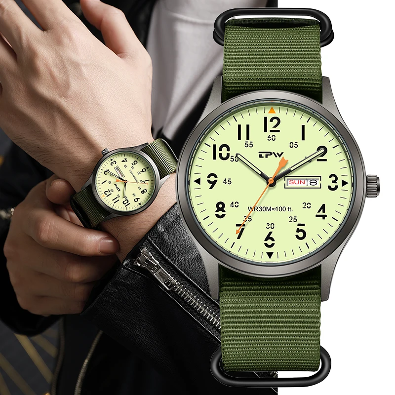 This is a *much* nicer watch in person than in the pictures and very much worth the price. The box arrived completely crushed but the packaging was good enough to protect it. The metal case is a beautiful gun metal gray which looks great next to the simple black face. The font for the day of the week and the date is nice too… strangely though, instead of having a second language the date wheel has english and english! I’ve seen a lot of watches in my old age but this is the first time i’ve never seen a second language. The second had *almost* lines up with the tick marks…i might take it apart and move the hands myself because that really annoys me, but for this process it’s acceptably close. Even the strap isn’t that bad and it’s perfectly useable. The black metal parts are a nice touch. Tpw *should* be proud of the work they did! I bought this as a gift for someone and if i didn’t already have a half dozen seiko and citizen field watches i’d buy another one for myself.