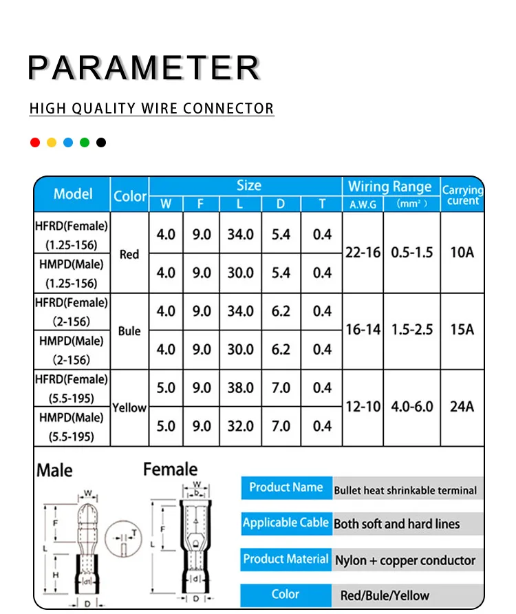 Wire range: 0.5-1.0mm2(Red); 1.5-2.5mm2 (Blue); 4.0-6.0mm2 (Yellow)