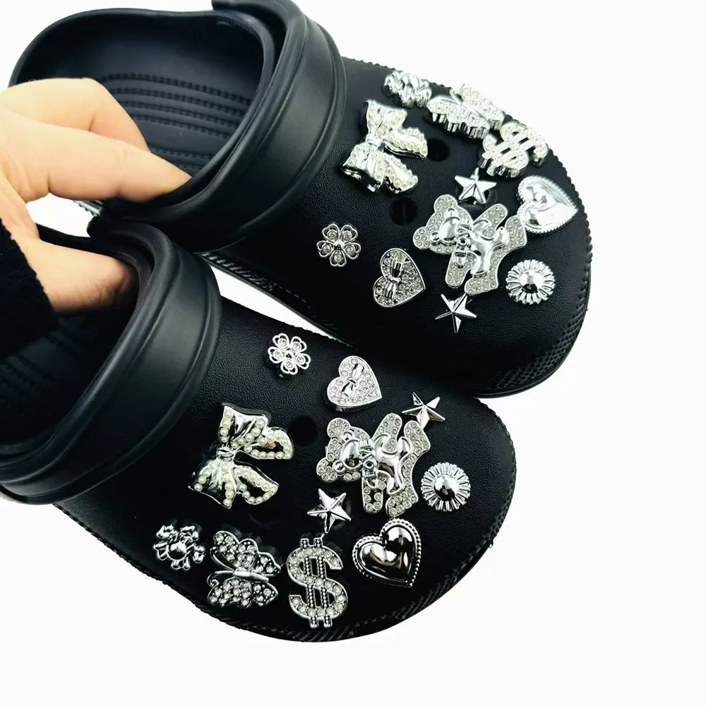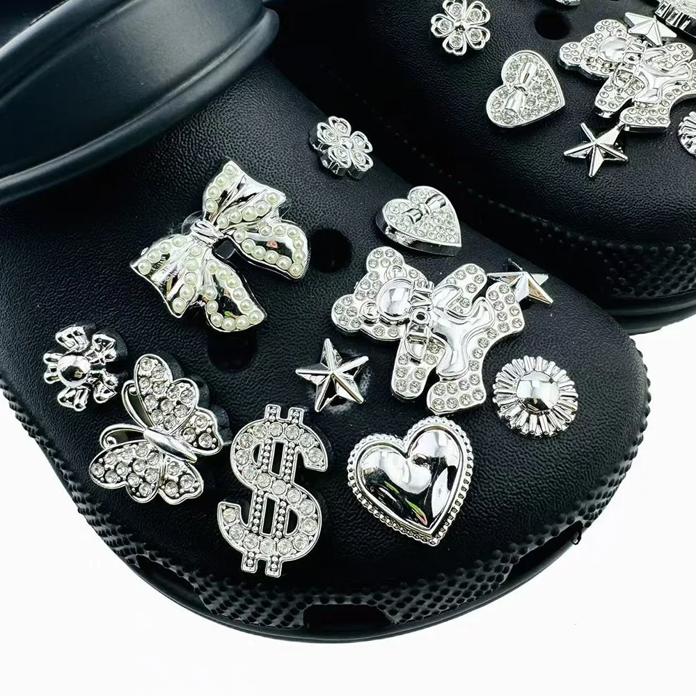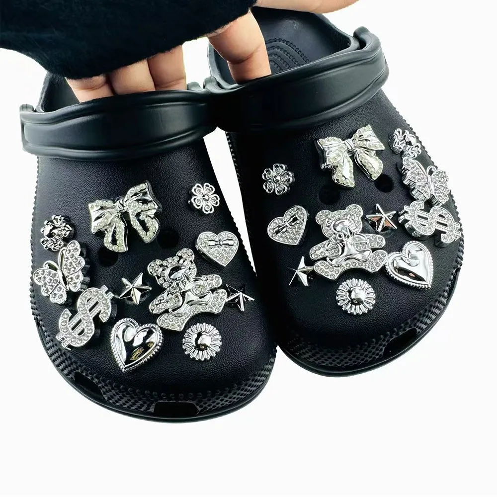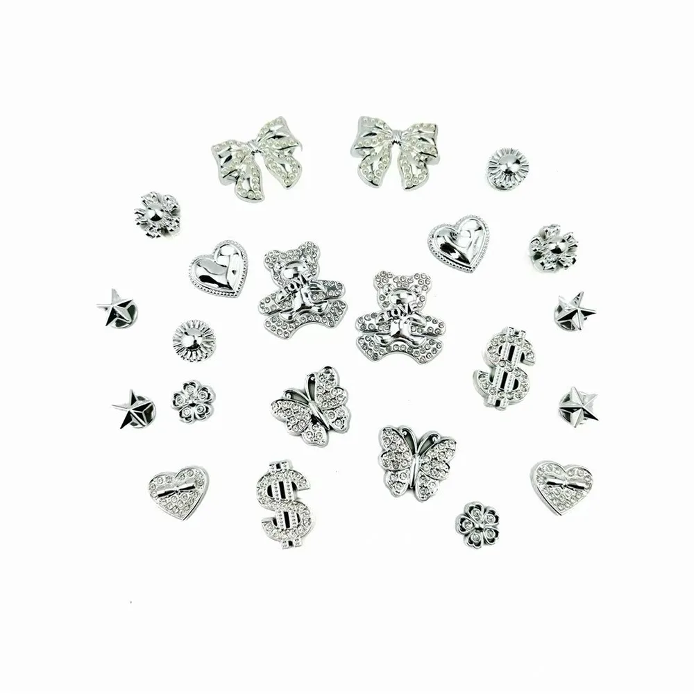 Featuring a charming assortment of silver diamond, bear, and butterfly motifs, these charms add a touch of creativity to your shoes.