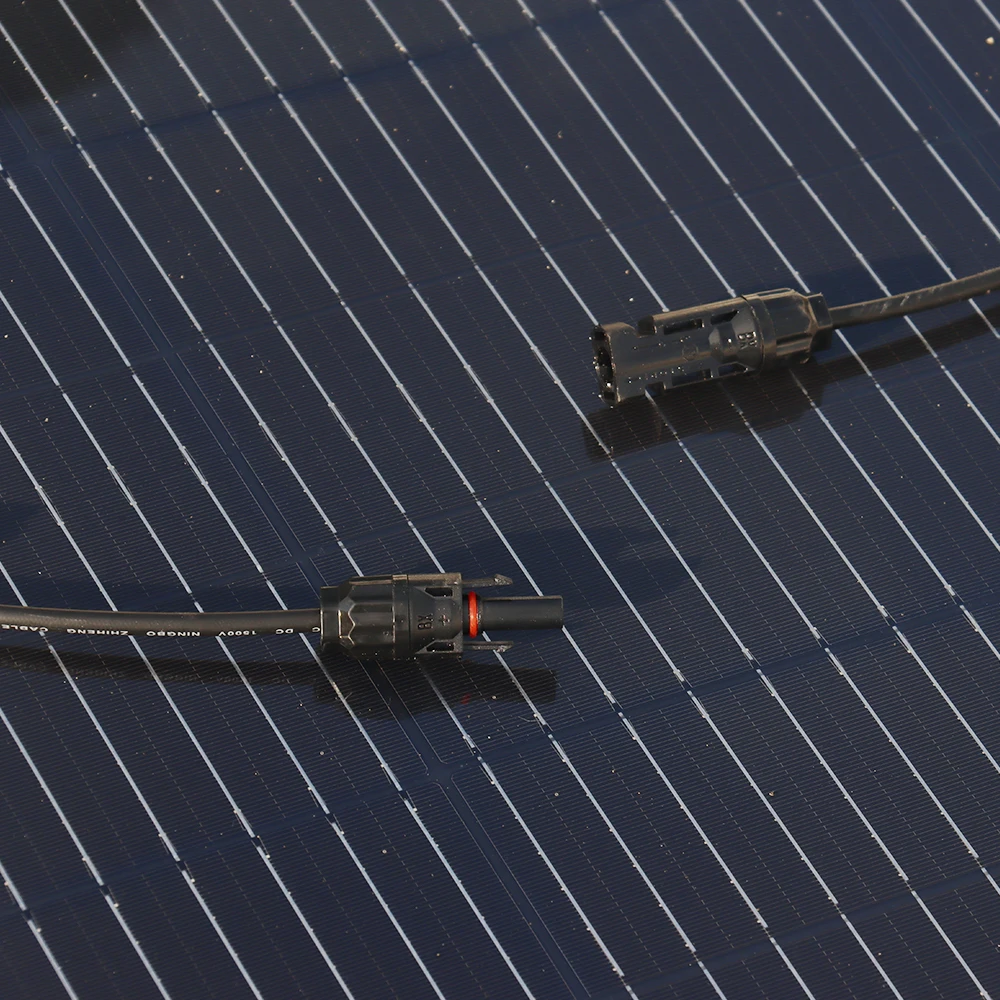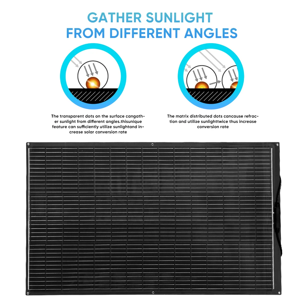 [Ultra-light and Flexible] A single solar panel weighs only 5.07 pounds and is only 0.098 inch thick. It can be easily picked up and carried. The solar panel be bent up to 260°. Ideal for mounting on RV ,roofs, campers, trailers, boats, cabins, tents, and other uneven surfaces.
