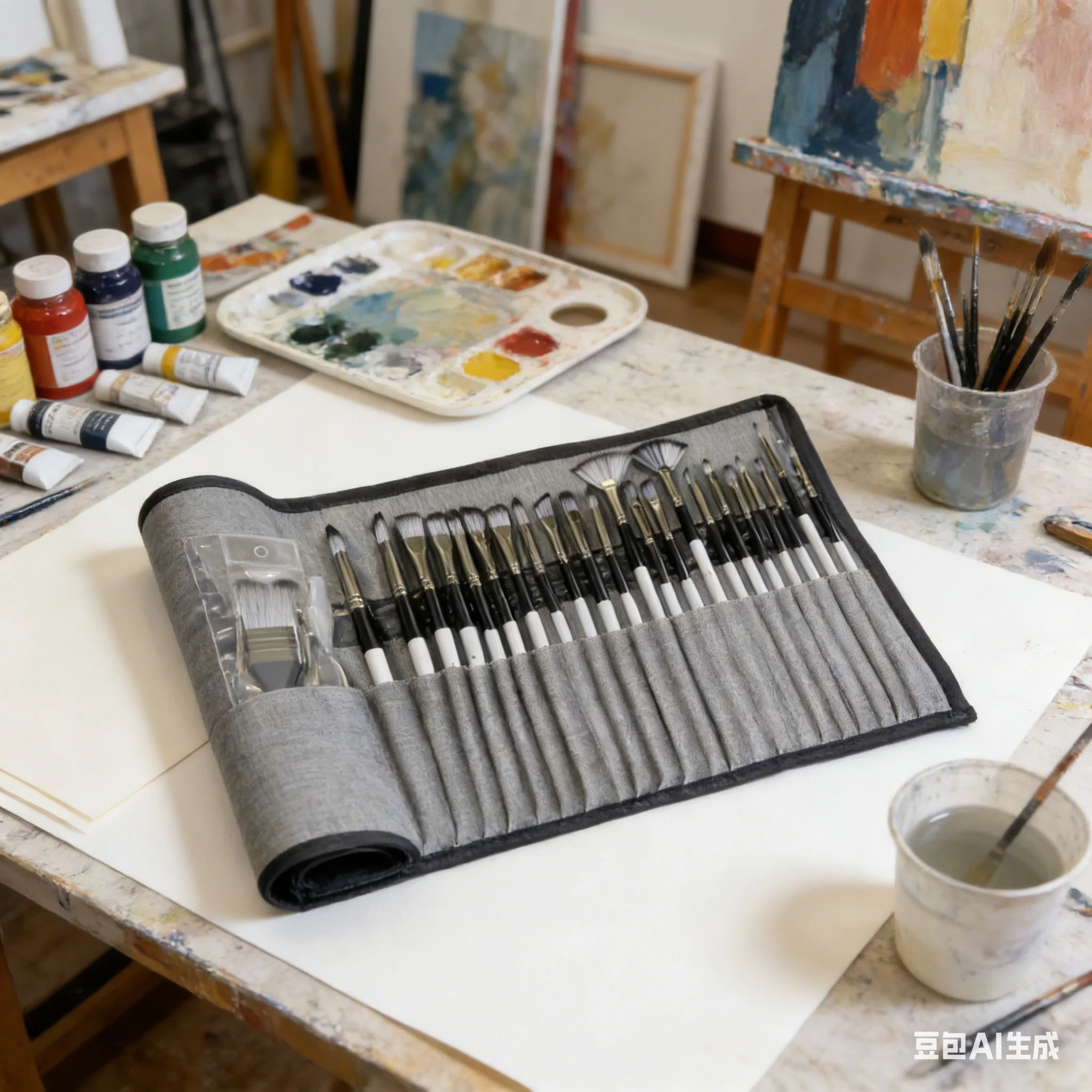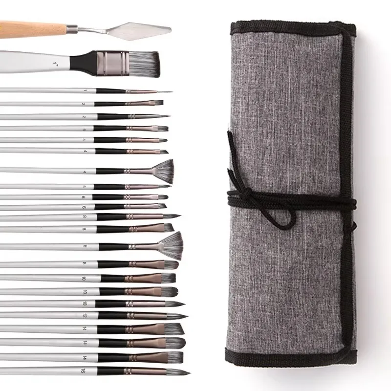 24-Piece Paint Brush Set with Palette Knife – Multi-Nib Art Brushes for Acrylic/Watercolor Painting (Canvas Roll Pouch)