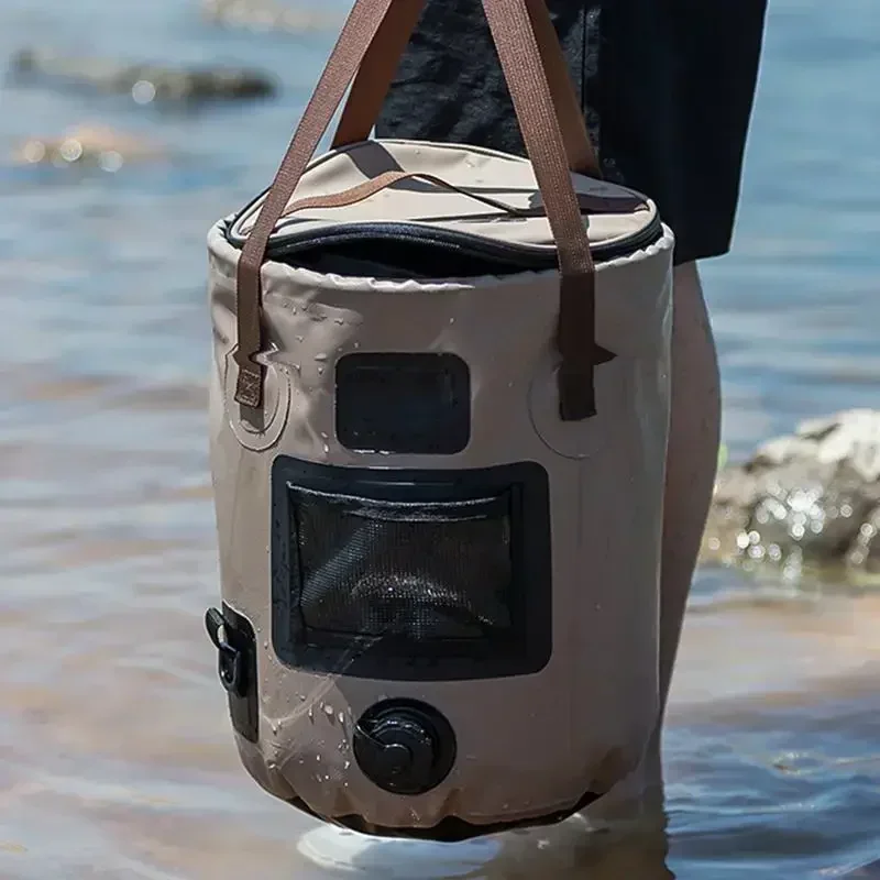 3.Efficient Operation: The collapsible camping fishing bucket has a valve for precise water flow and a removable mesh bag for catching debris, making watering plants a breeze. Easy to use and perfect for outdoor gardening.