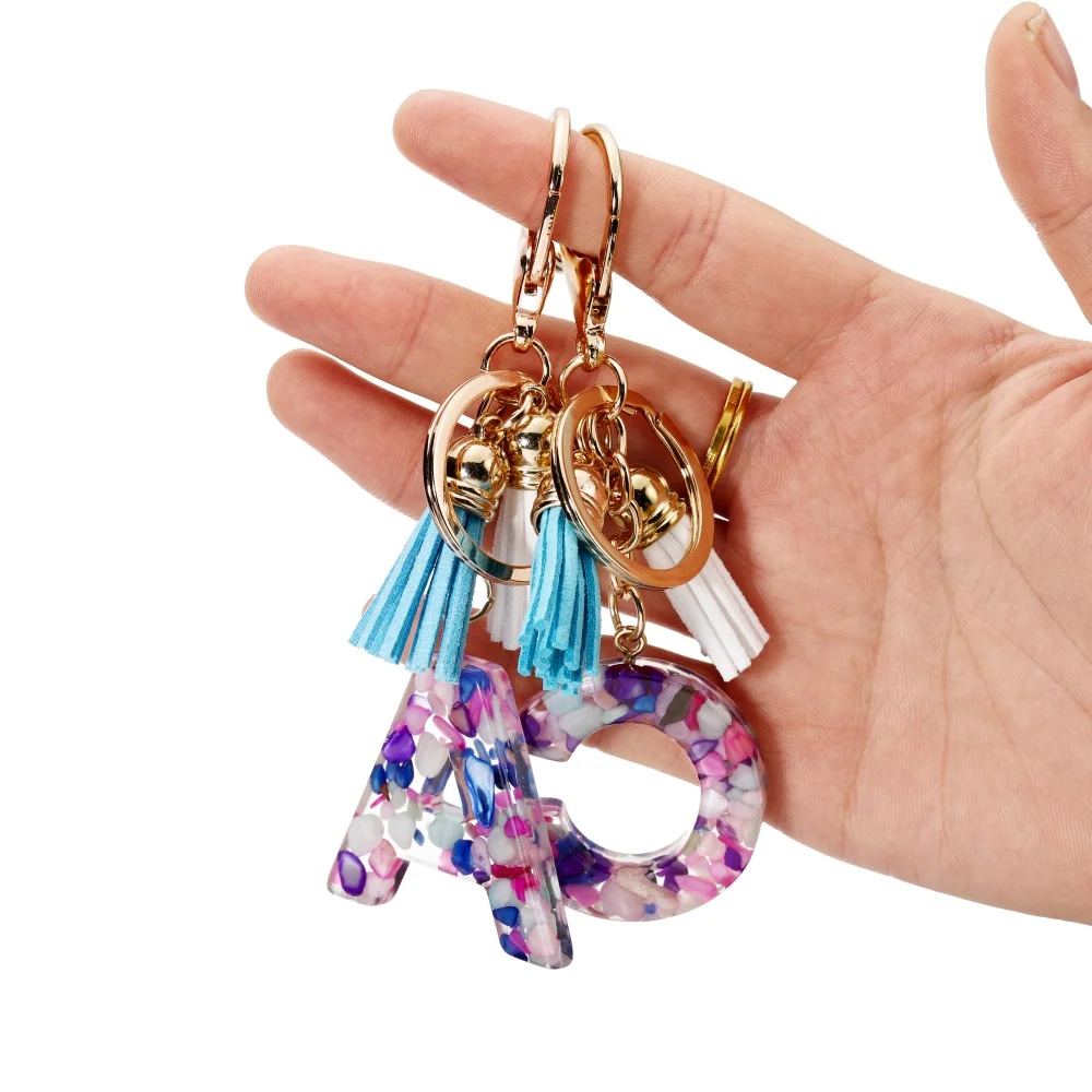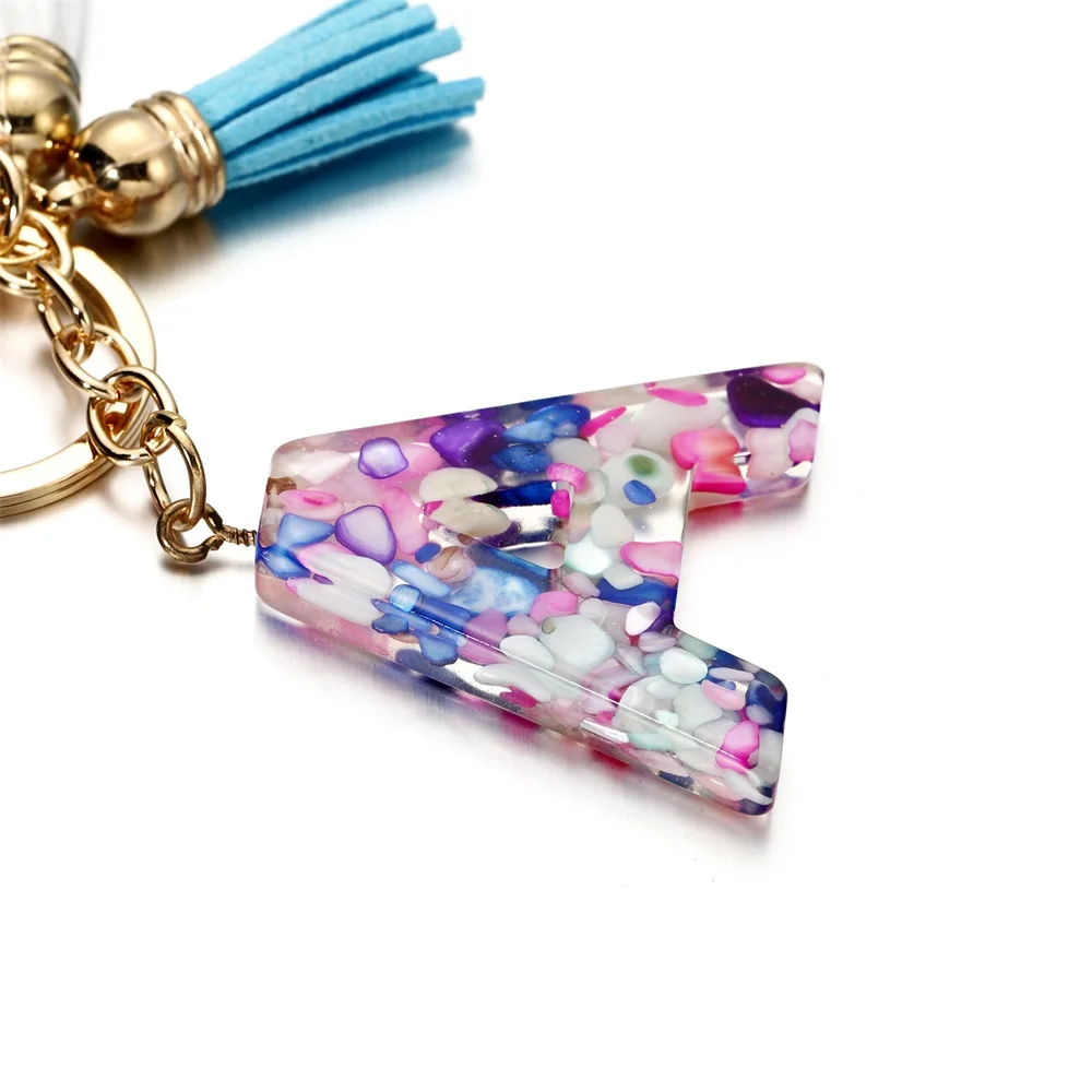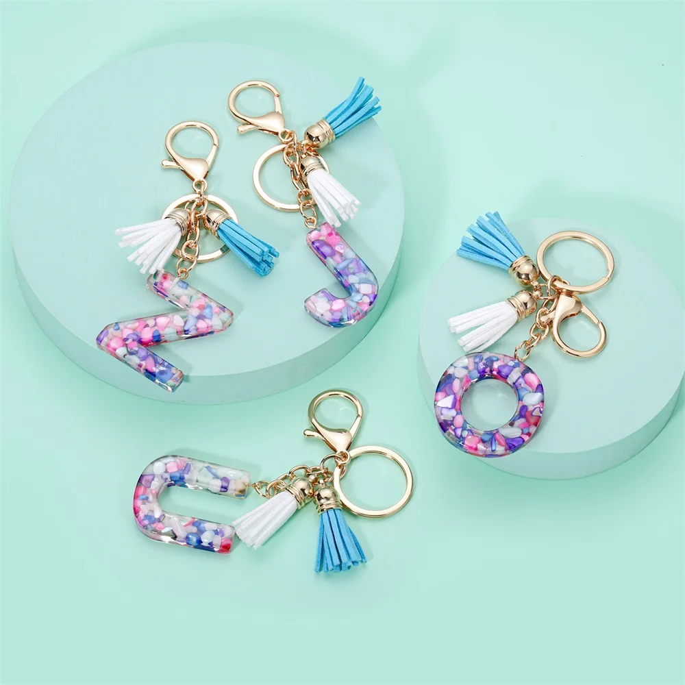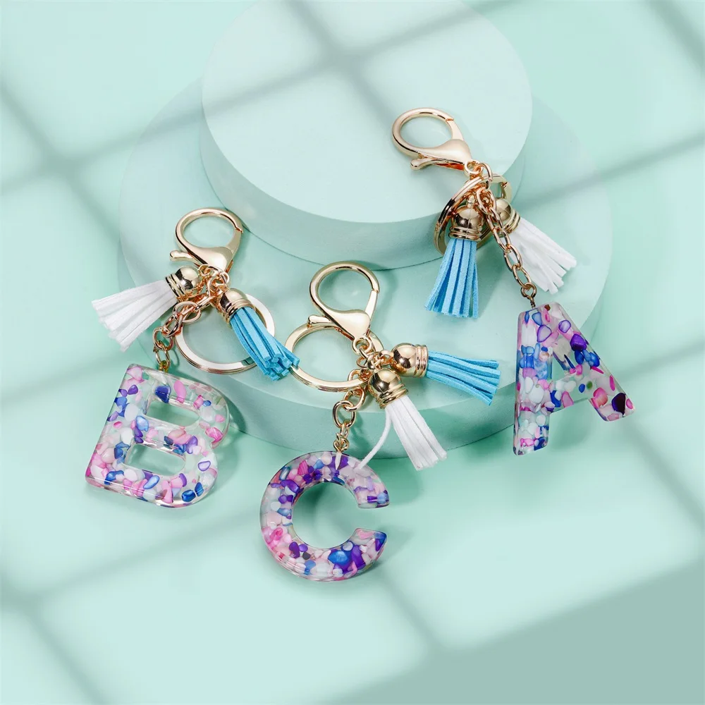 26 Initials Letter Key Pendant with Velvet Tassel Fashion Girls Handbag Glitter Gradient Resin Alphabet Keychain Charms