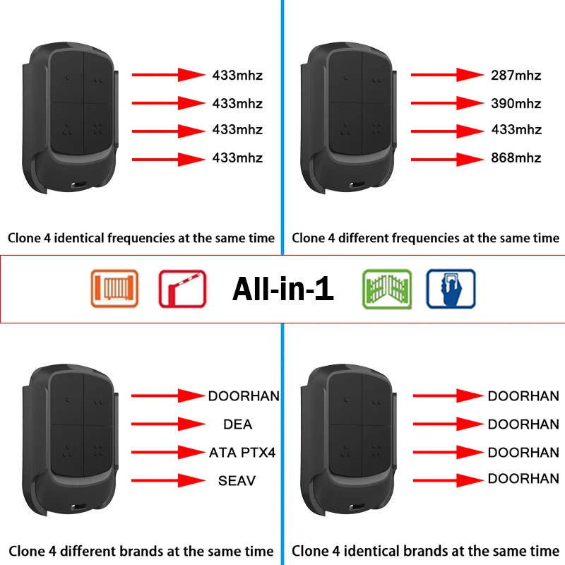 It is a multi-frequency remote control, compatible with 99% of garage door remotes on the market, but not universal, if you are not sure whether your remote control is compatible, please send us your remote control picture, we will help you examine