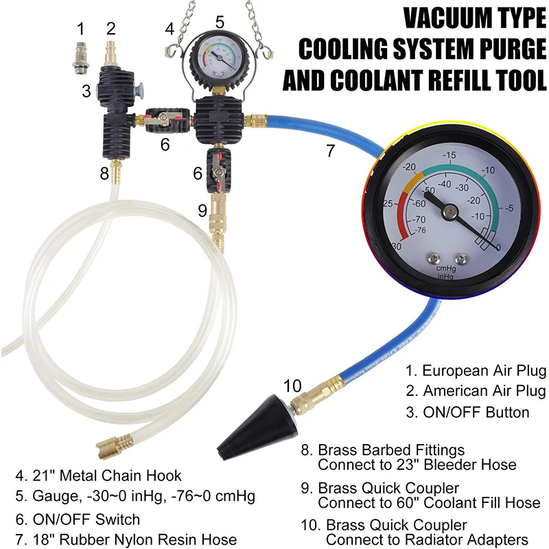 1. All-in-one integrated coolant pressure tester fill kit includes leak detection, temperature measurement and coolant fill functions. The radiator pressure tester applies pressure to the reservoir/cap and observes the needle drop over time to confirm system leaks. The coolant vacuum fill tool uses a vacuum pump to extract air, creating a vacuum that draws coolant into the cooling system. Coolant is added under vacuum without large air pockets to avoid engine distortion or other damage. 2. The cooling system pressure tester and coolant bleed kit is equipped with 17 specific adapters and 1 universal tapered rubber adapter for almost all types of radiator openings on classic and modern vehicles. Included are 3 radiator cap test adapters and 2 connectors to help diagnose radiator cap leaks on most vehicles. All these adapters are color coded and specially placed for easy and unconfusing selection according to the marked pictures in the instruction manual. 3. Plastic covered high quality brass manifold body with brass fittings for corrosion protection and durability. The index range of the instrument is -30 to 0inHg (-76 to 0cmHg), usually -25 to -20inHg is the correct time to add coolant. 18" rubber resin material braided reinforced hose with corrosion resistance, low fluid resistance, and high pressure-bearing features ensure durability and good air sealing. Includes 21" metal barb, 23" clear bleed tube and 60" filler tube. 4. Radiator coolant pressure test tool features aluminum pump barrel instead of plastic, 21" rubber nylon resin hose with brass fittings for rugged durability. 3" large dial pressure gauge with index range 0-35psi (0-2.5bar) for easy viewing. Stainless steel thermometer, index range 0 to 200°C (32 to 400°F). Includes American and European style air plugs for your choice. Custom blow-molded case keeps everything in place and protects the gauge during storage 5. This set is widely compatible with for GM, for BMW, for VW, for GMC, for Porsche, for Chevrolet, for Dodge, for JEEP, for Chrysler and many other models of car truck airlifts. Any questions, please feel free to contact us by email