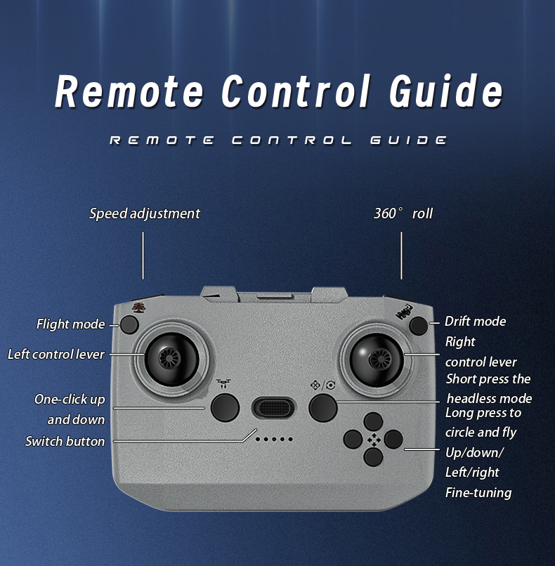 Land drift mode/One-click takeoff/One-click landing/Ascent/Descent/Left and right turns/forward/Backward/Left flight/right flight/Roll/Headless mode/Surround flight/fast and slow gears/Fine-tuning/speed adjustment