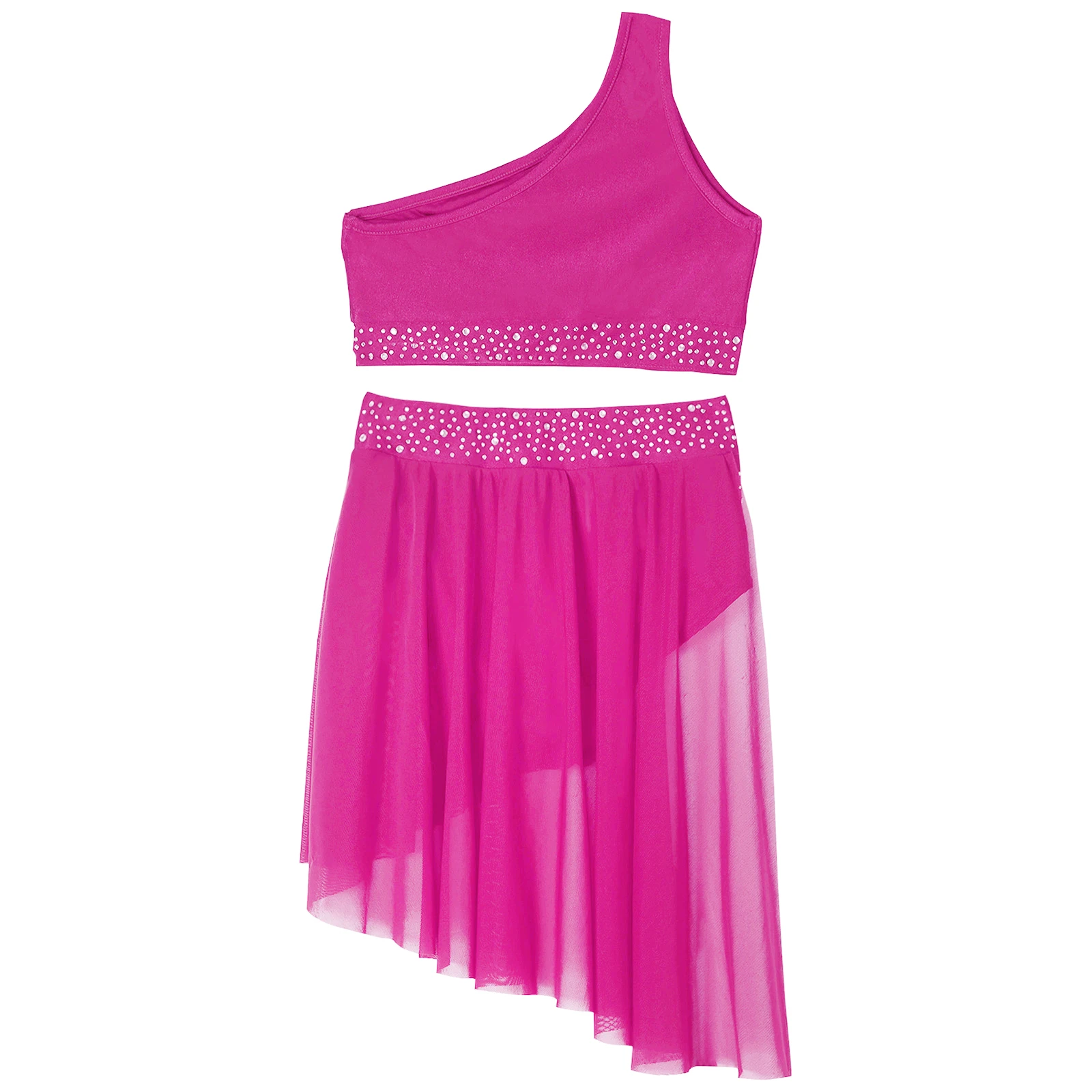 Kids girls’ lyrical dance performance outfit with rhinestones that sparkle under the light to brighten up any performance.