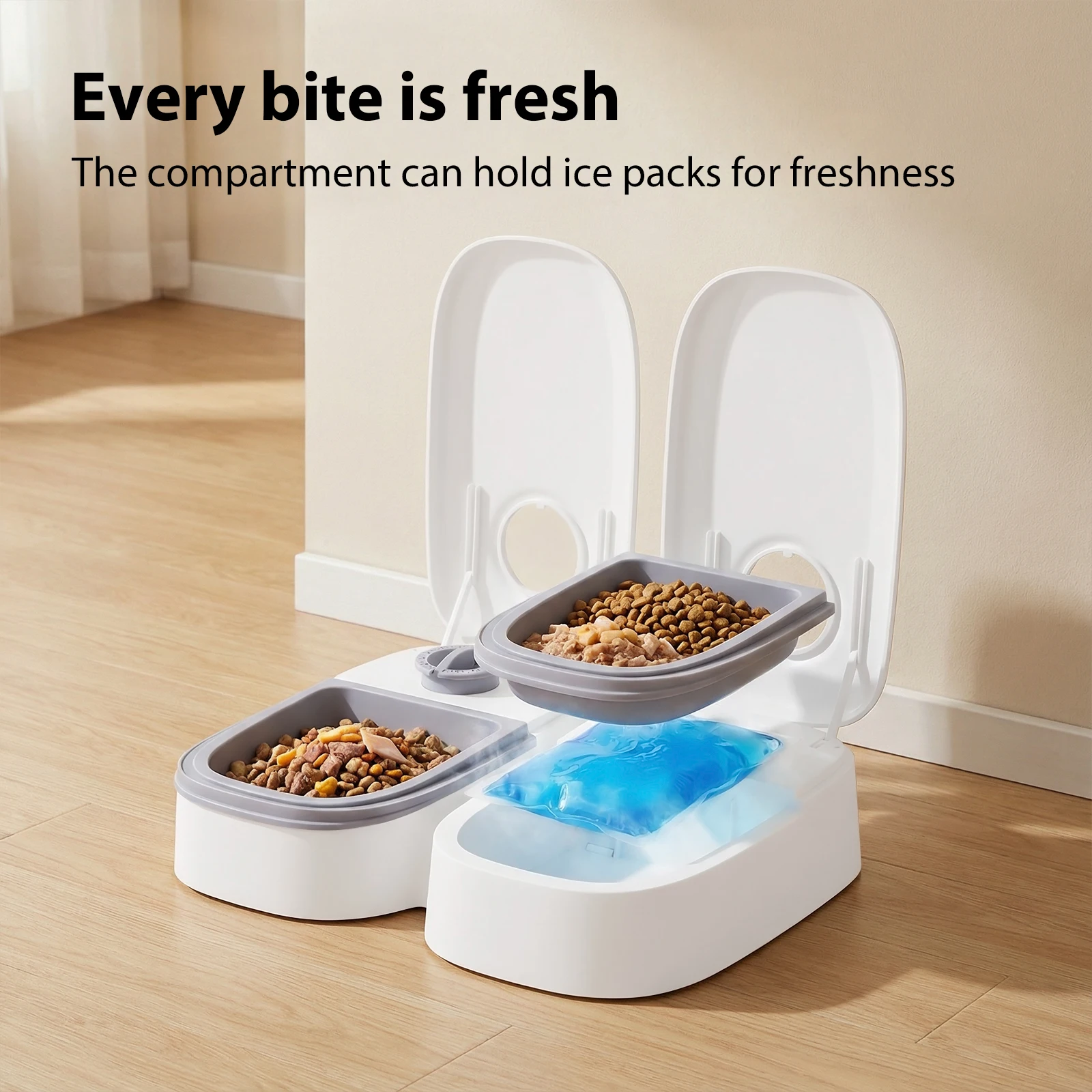 💦🐾 【Keep Food Fresh】The automatic cat feeder features a removable design with a special compartment at the bottom for ice packs to keep wet or raw food fresher for longer, ensuring that your pets appetite will be whetted no matter what they eat. (Note: This product does not come with ice packs)